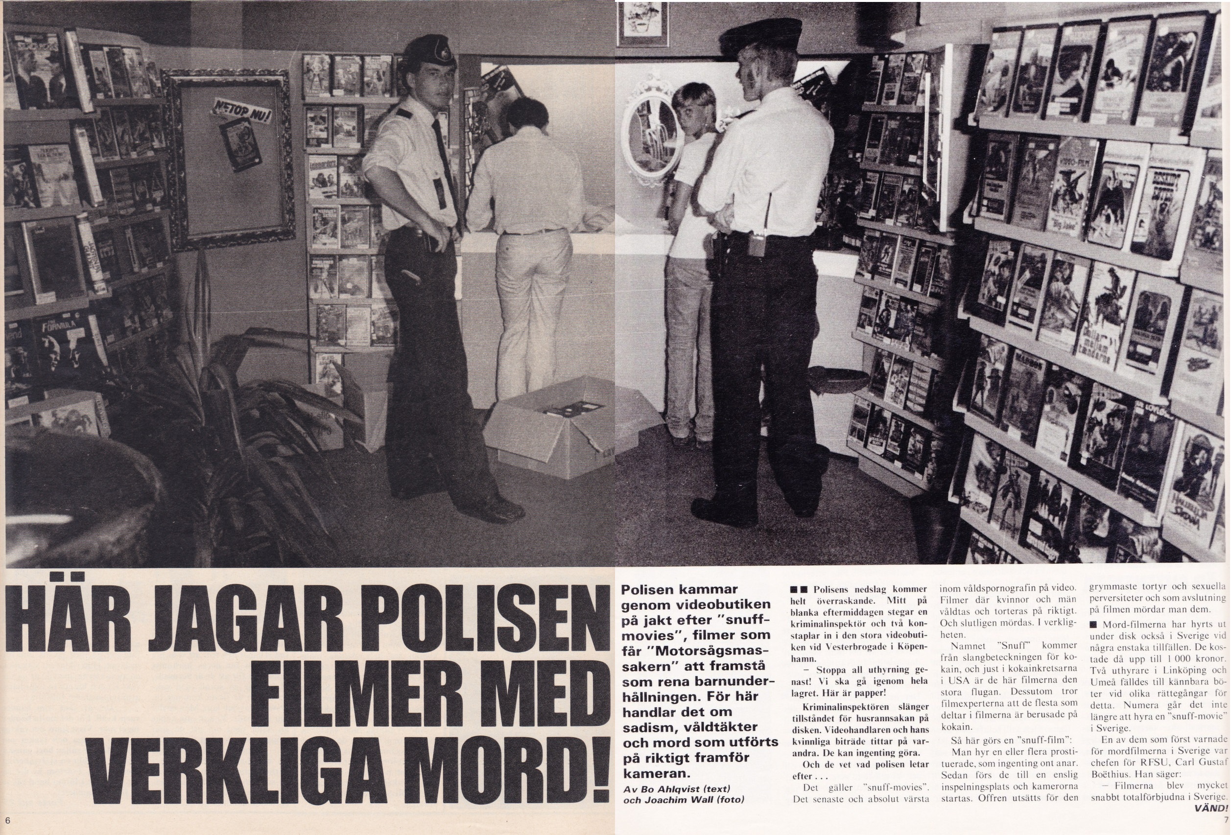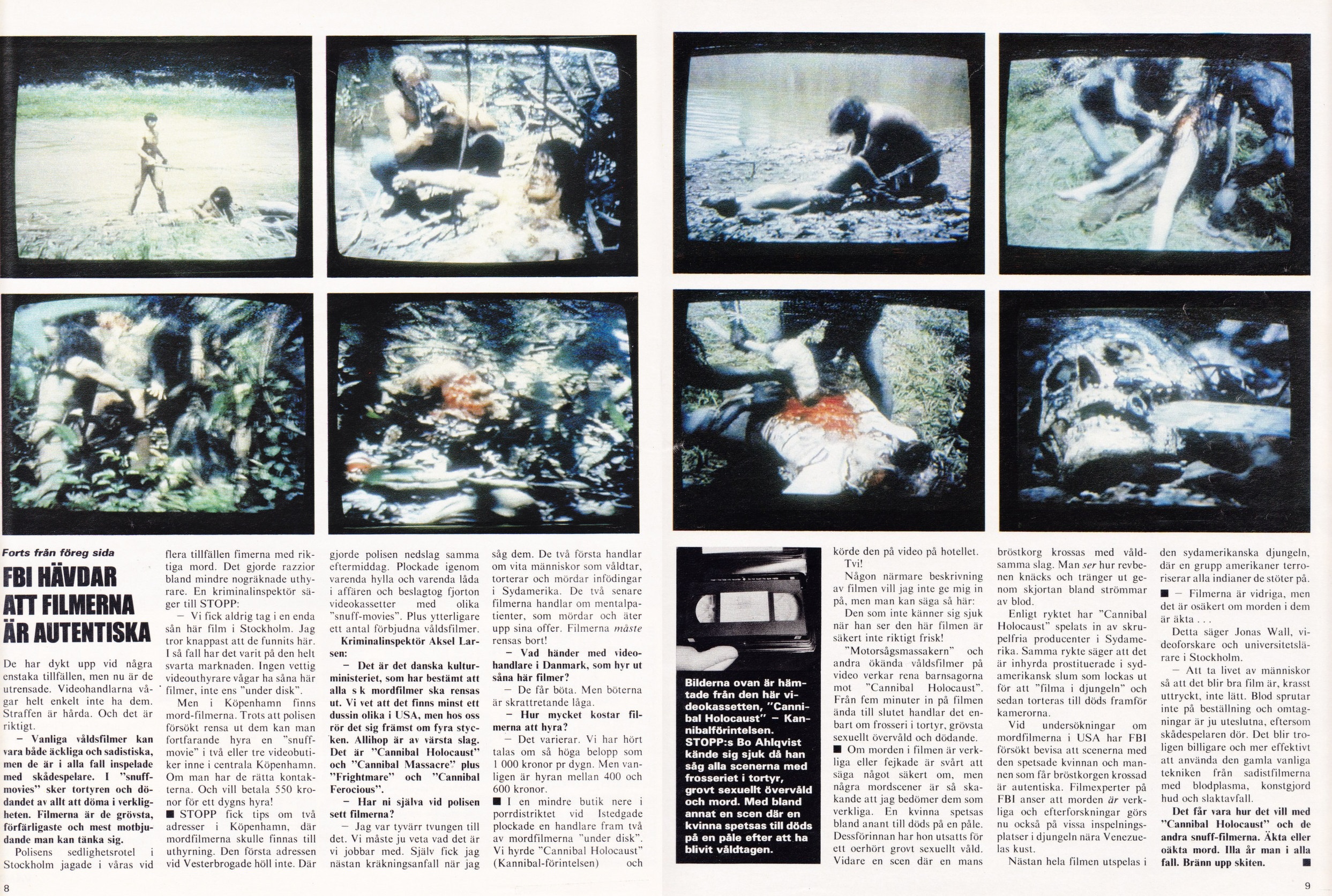 Den mest kittlande paniken är nog kring de så kallade ”snuff-filmerna”, det vill säga filmer där folk mördas på riktigt för filmens handling. Många filmer ha påstått haft verkliga mord, från New york ripper, Guinea pig, till Cannibal Holocaust som artikeln i Stopp Fib aktuellt nr 43 1983 handlar om.