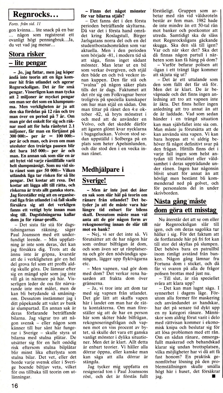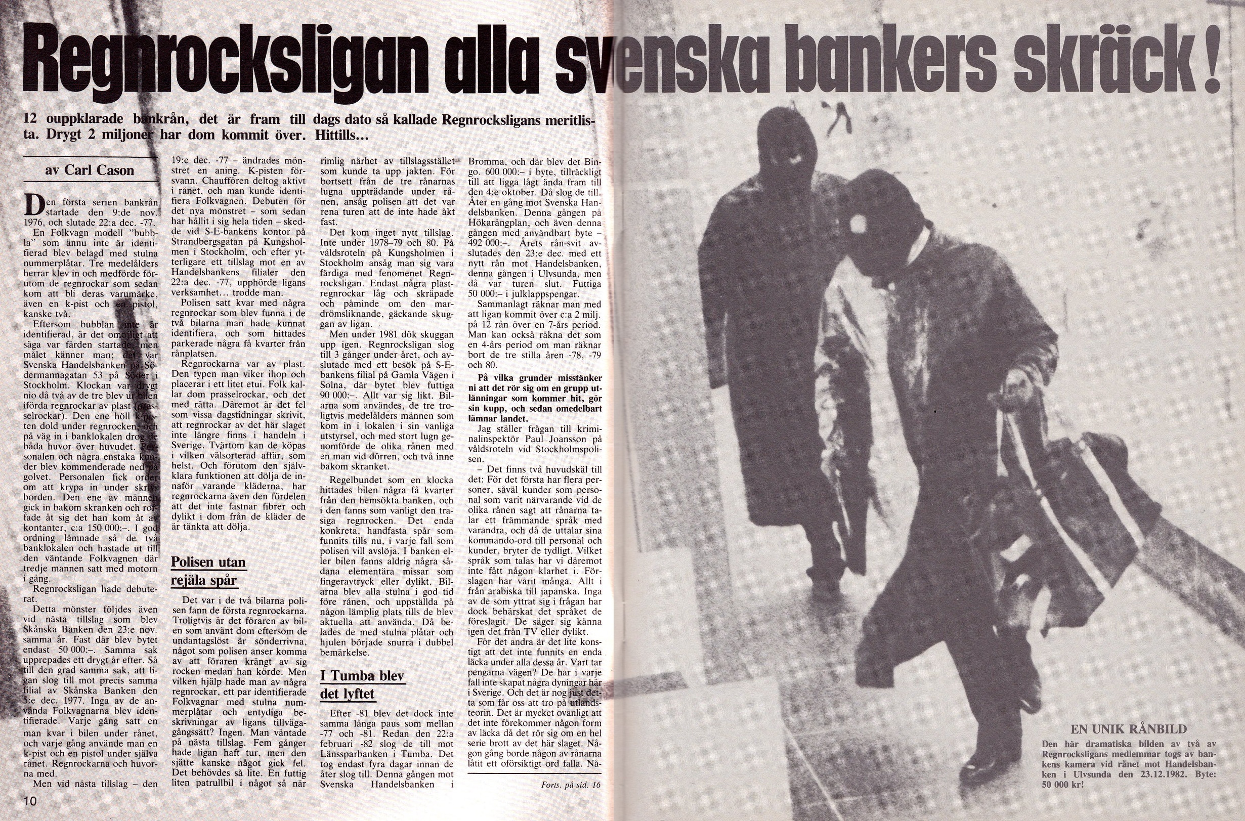 Mellan 1977 till 1982 så gjorde en ligan som fick namnet regnrocksligan (på grund av att de gjorde deras bankrån iklädda i regnrockar) 12 olika bankrån utan att åka fast (enligt artikeln från 1983). Väldigt lite information finns om detta gänget på nätet. Förutom artikeln från Veckans brott nr 8 1983 som jag postar här så finns det en artikel i expressen om en mördad man som skall ha varit med i regnrocksligan.