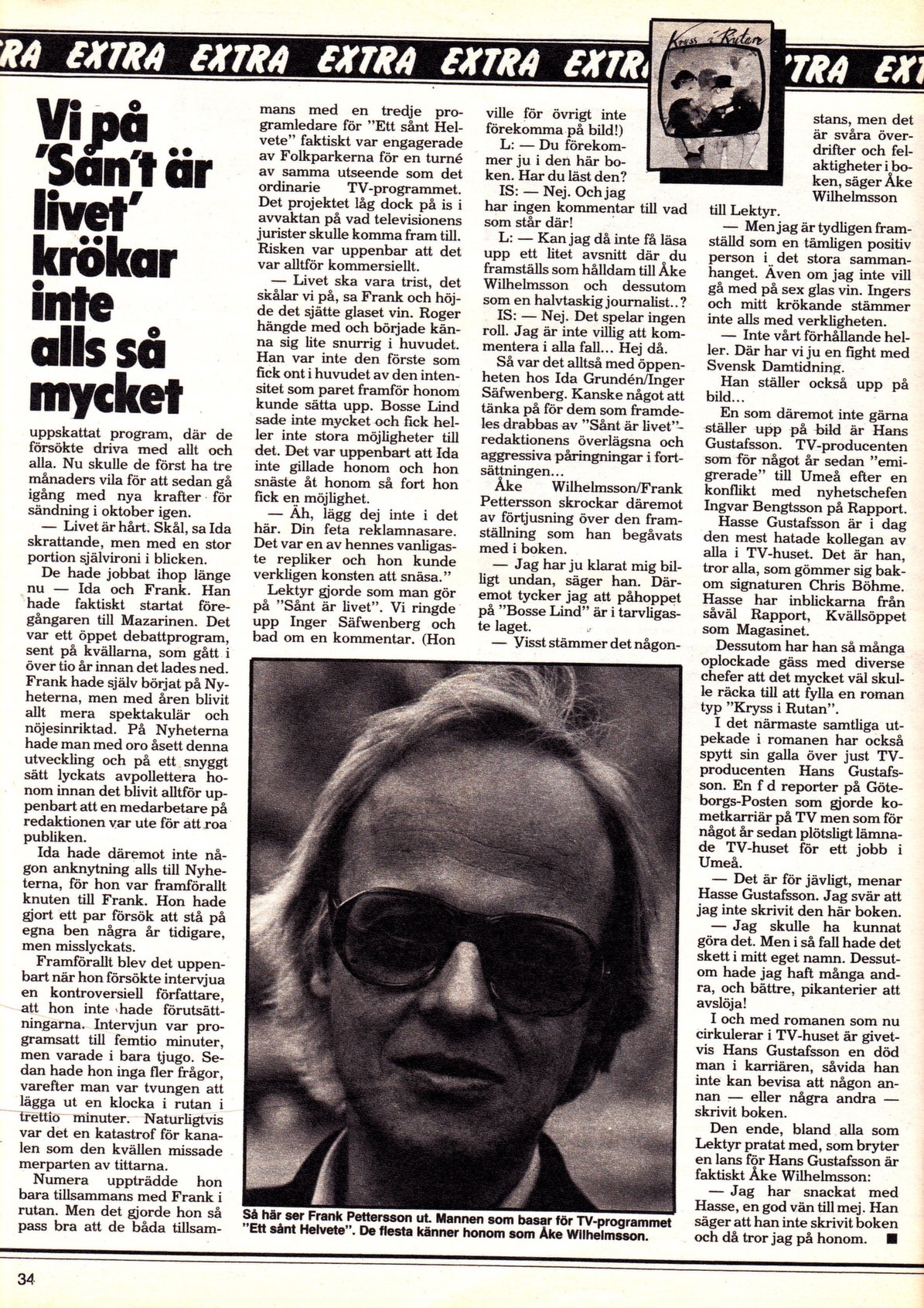 Mitt i allt detta så fanns det ett ”krig” mellan nyhetsprogrammen Aktuellt och Rapport. Det handla om vem som hade de bästa sändningstiderna och om vem som var högst i statushierarkin. Mitt i allt detta så släpptes pseudonymen Chris Böhme (enligt Lektyr så är det pseudonymen för journalisten Hasse Gustafsson) boken ”Kryss i rutan” (Askelin & Hägglund) 1982. Den ska handla om spelet bakom kulisserna, bråken, festerna, vilka som idka samlag med varandra med mera.
