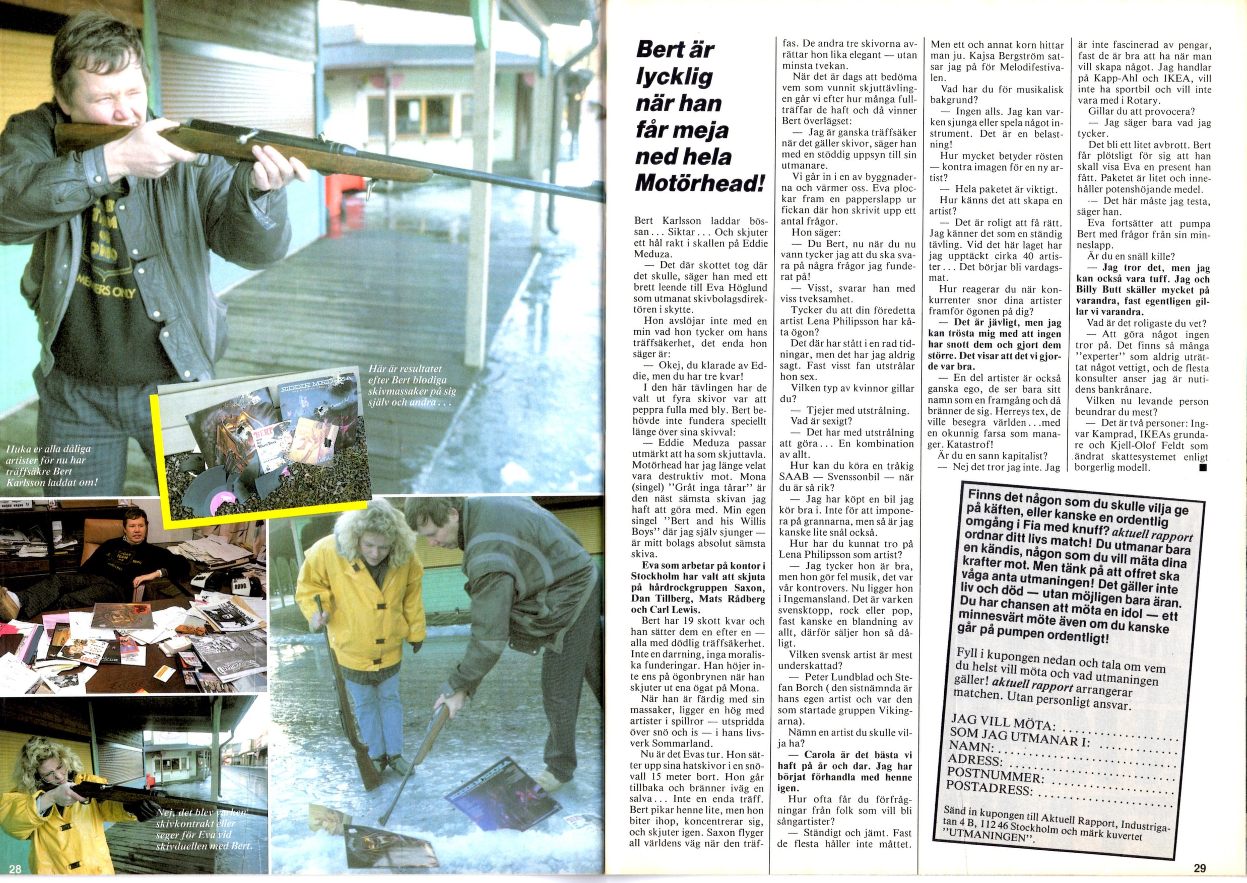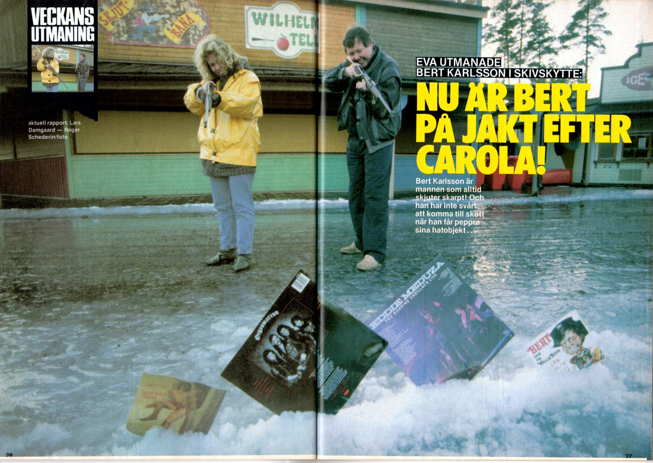 Ännu en gång visar Aktuell Rapport prov på en utmärkt grävande journalistik. Jag har i ett tidigare inlägg publicerats en artikeln där Svullo och Biffen har en Clockburgare tävling. Denna gången, i nr 7 1989, så utmanas Bert Karlsson av Eva Höglund i den fascinerande sporten skivskytte. Vad jag vet så är den sporten inte någon OS-gren, än i alla fall. Jag tycker att Berts val av vilka skivor han vill skjuta på är kul, där bland annat Eddie Meduza och Motörhead får på moppo.