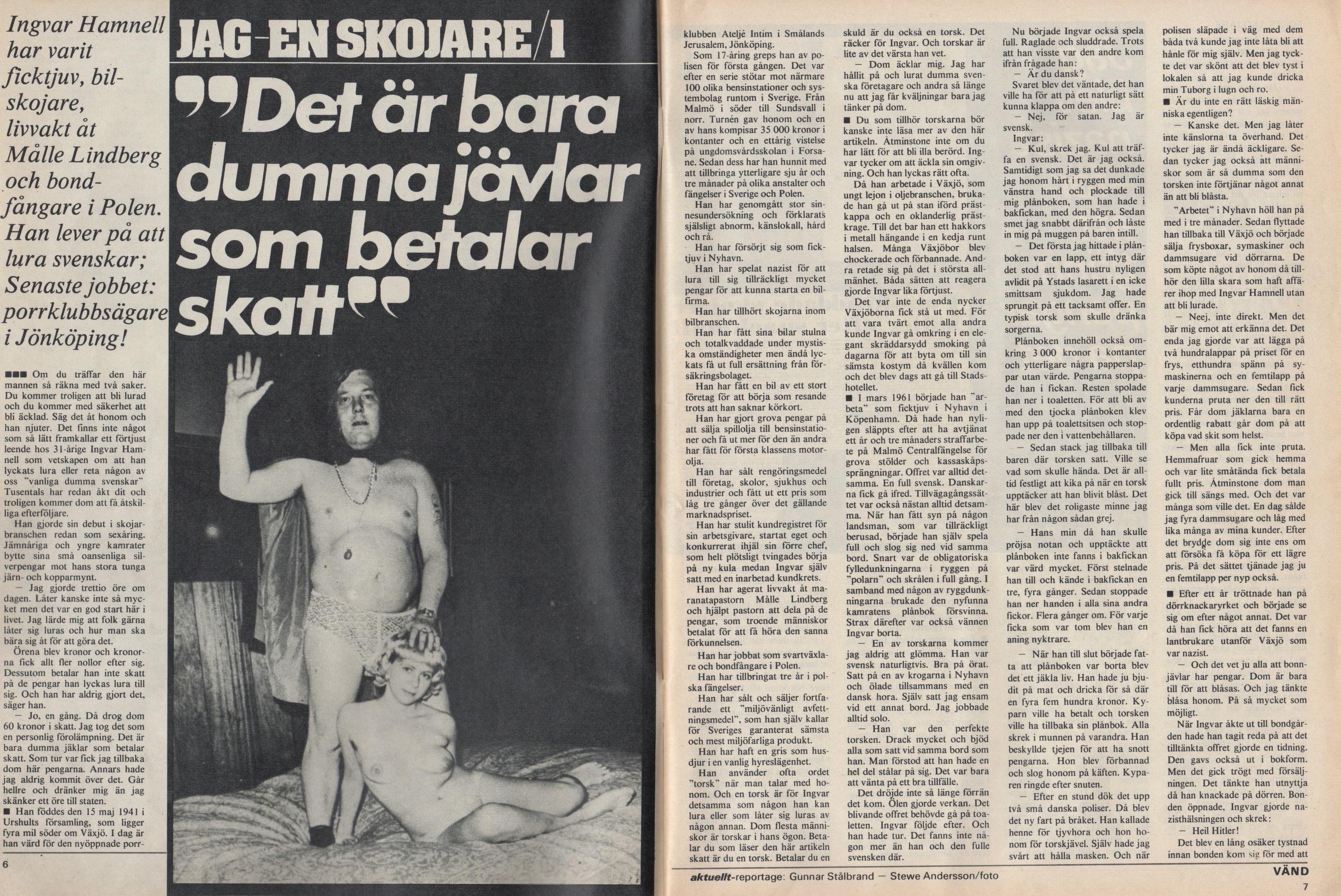 Spjutspetsjournalisterna på Fib aktuellt var alltid alerta och på hugget när det fanns en bra och intressant story att förtälja om. Historien om skojaren Ingvar Hamnell som publicerades i nr 31 och 32 1972 är ett klockrent exempel på utmärkt herrtidningsjournalistik. Jag skrattar, fascineras och skakar på huvudet till en historia som är helt fantastisk.