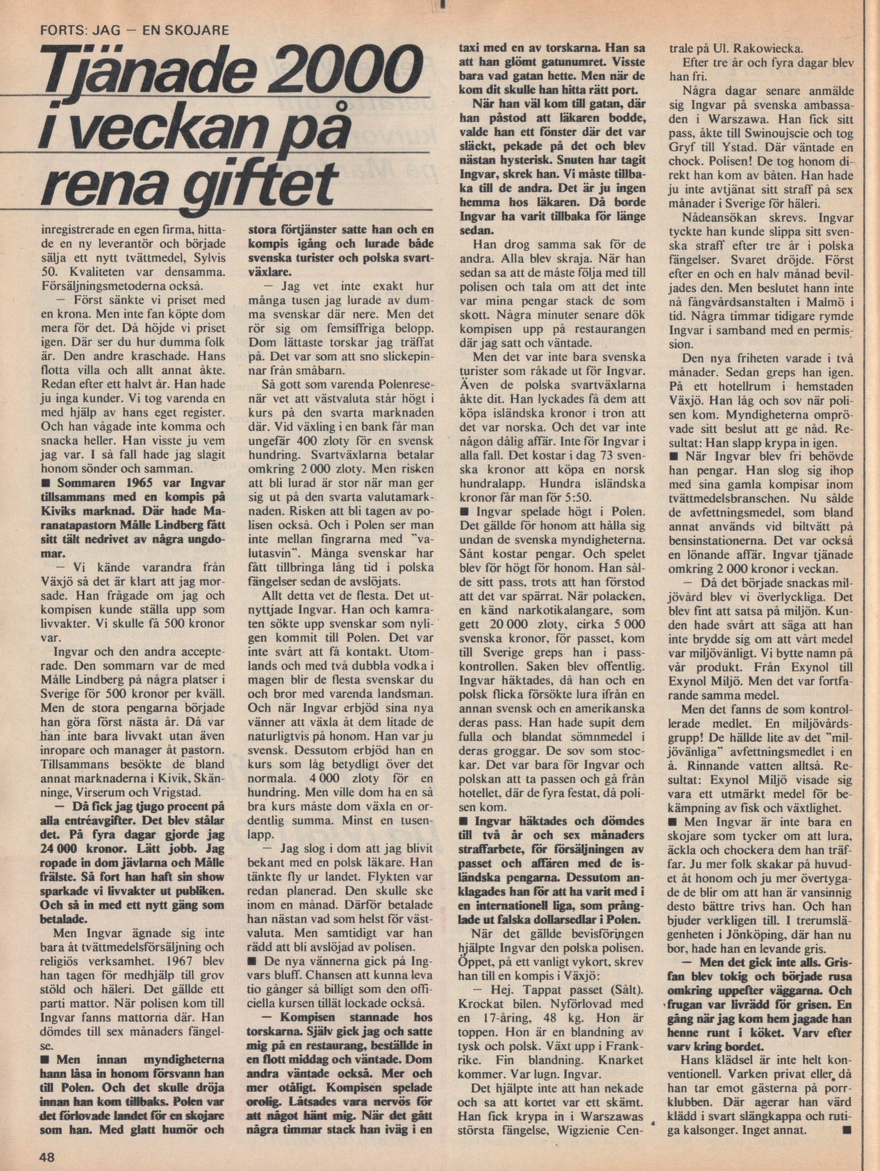 Artikeln bjuder på många skratt och en av favoriterna är historien om vykortet som Ingvar skickade från Polen till en kompis i Växjö, som polisen sedan kunde använda mot honom. På vykortet hade Ingvar skrivit: ”Hej. Tappat passet (sålt). Krockat bilen. Nyförlovad med en 17-åring, 48 kg. Hon är toppen. Hon är en blandning av tysk och polsk. Växt upp i Frankrike. Fin blandning. Knarket kommer. Var lugn. Ingvar”.