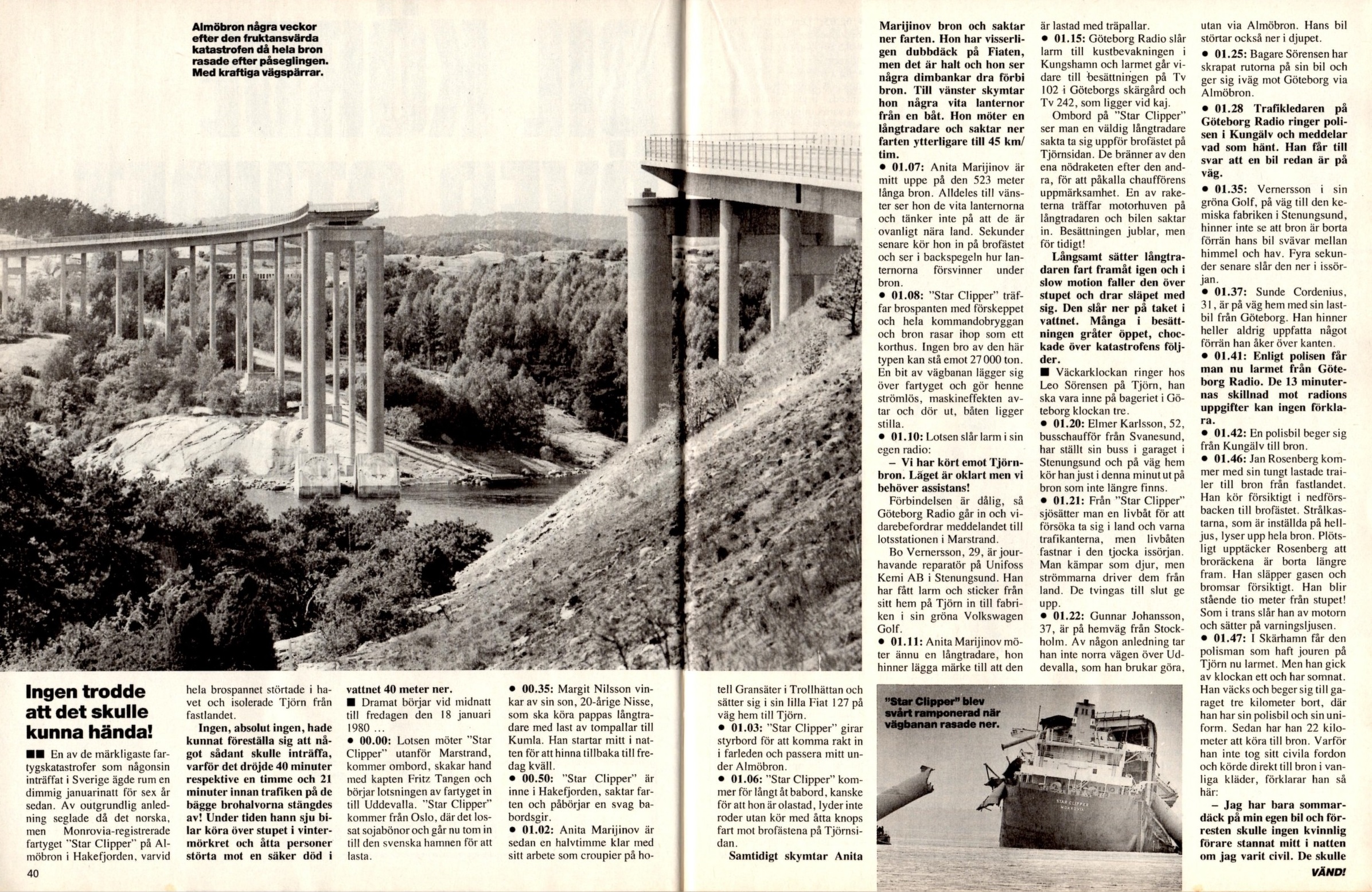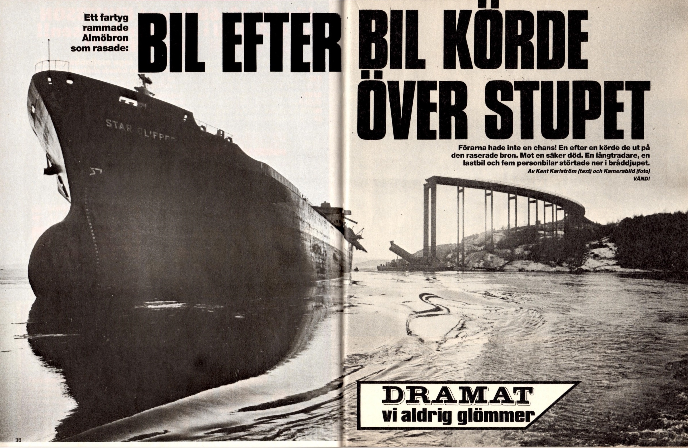 Jag har ett svagt minne av olyckan när fartyget Star clipper (bra namn) kör in i Almöbron så den rasar. Jag vet inte om det är från själva rapportsändningen 1980 (när jag var väldigt ung) eller från ett senare tillfälle. Rapportsändningen finns i alla fall på youtube: