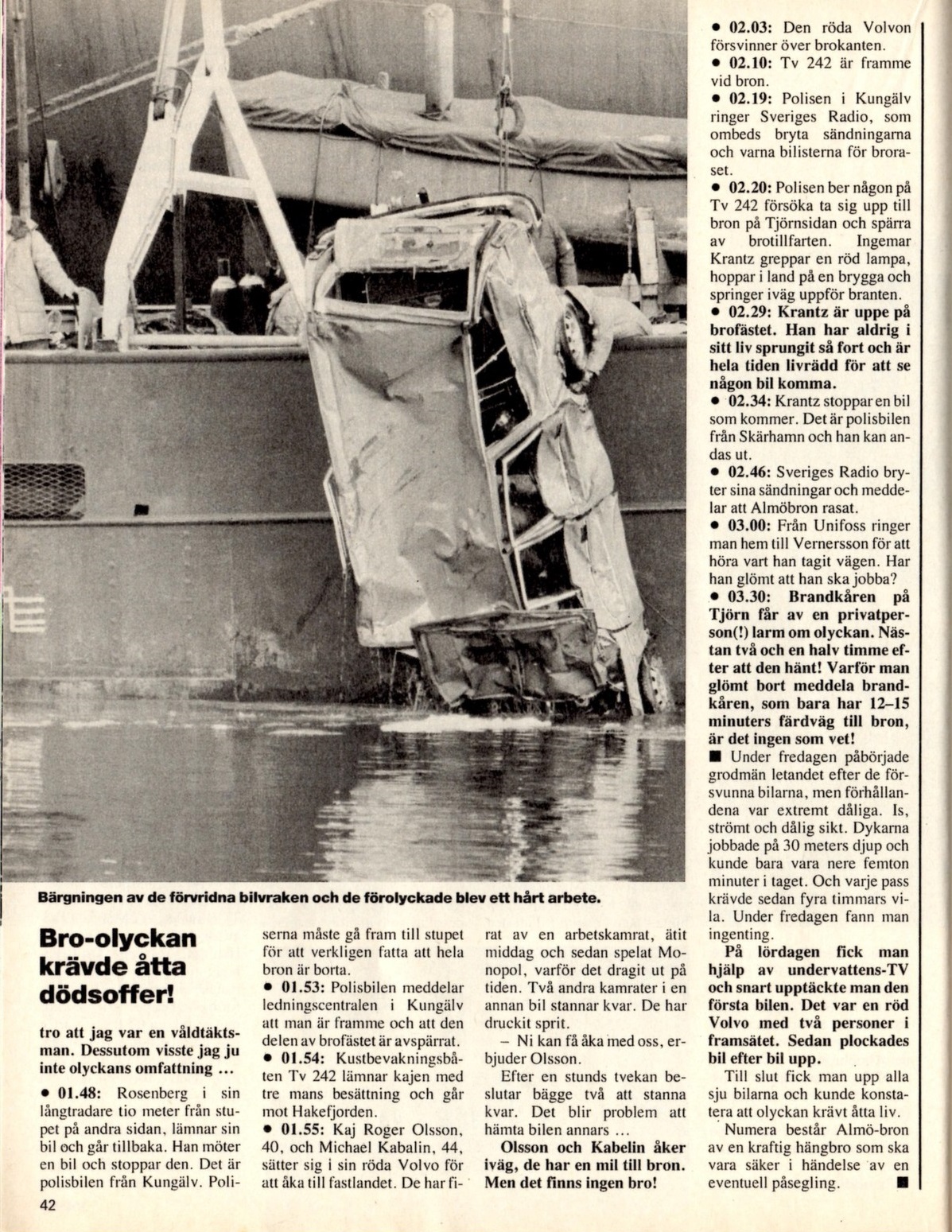 8 st människor hann kör rakt ner i det iskalla vattnet och dö innan polisen spärra av bron. I veckans stopp nr 12 1986 tar journalisten Kent Karlström upp fallet.