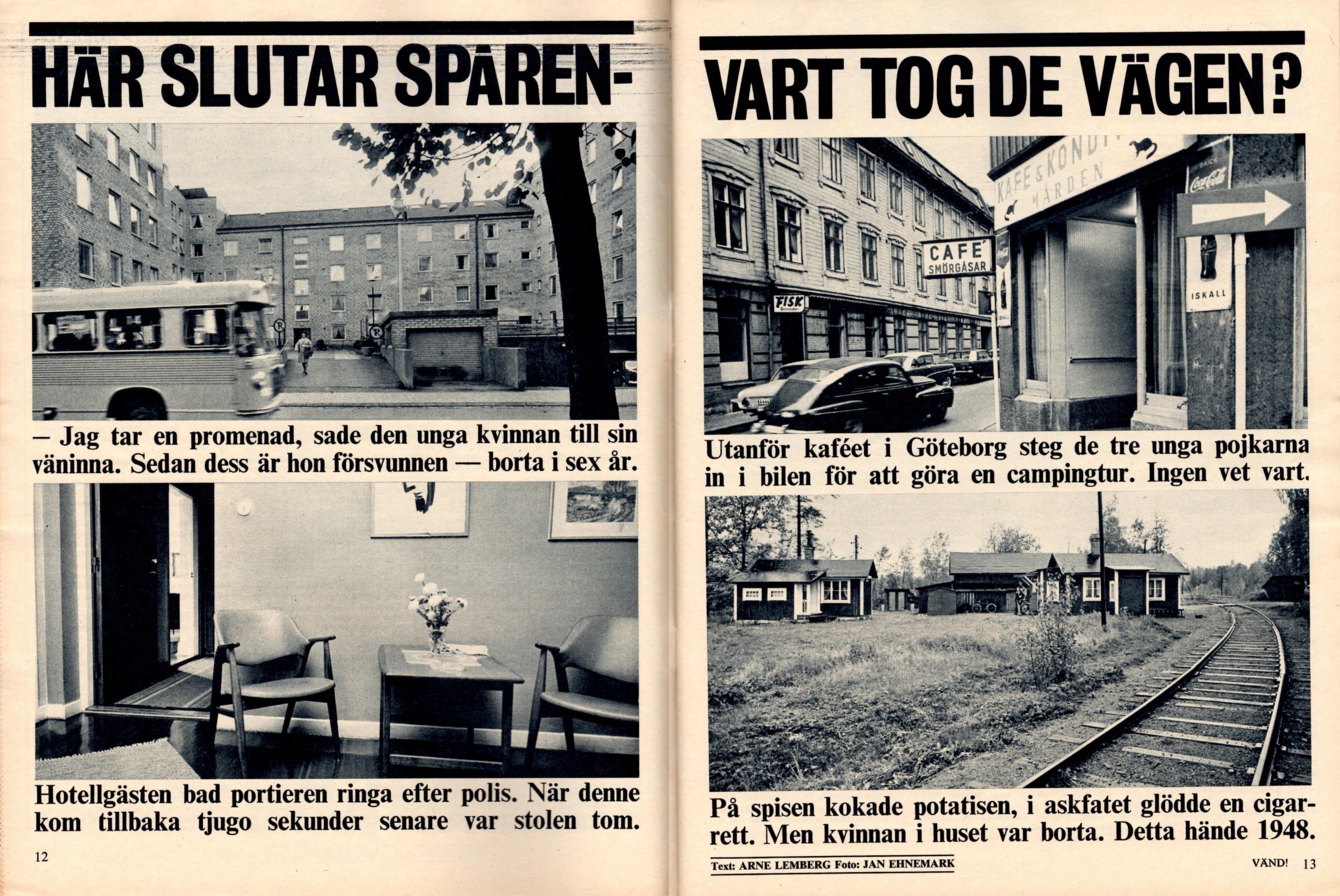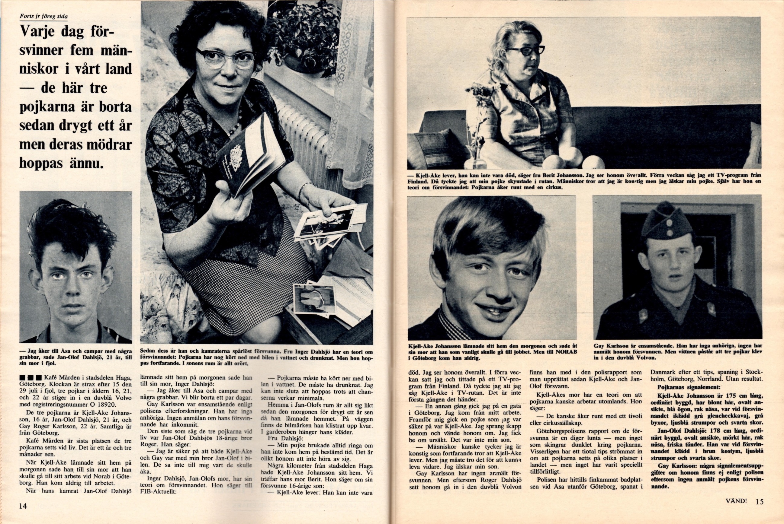 Det är fredagskväll och här är vädret riktigt trevligt. Vad passar då inte bättre än ännu en källarluktande artikel från Mr herrtidnings samling? Denna artikeln publicerades i Fib aktuellt nr 42 1966 och där tar den legendariska journalisten Arne Lemberg upp fyra fall av mystiska försvinnanden som än idag, ca 50 år senare, är olösta. Första fallet handlar om Dahlsjö-fallet, där tre unga killar, Kjell-Åke Johansson, Jan-Olof Dahlsjö och Gay Roger Karlsson försvann från Göteborg den 29:e Juli 1965. Det finns en massiv tråd om fallet på flashback och det finns även en hel del info på metapedia.