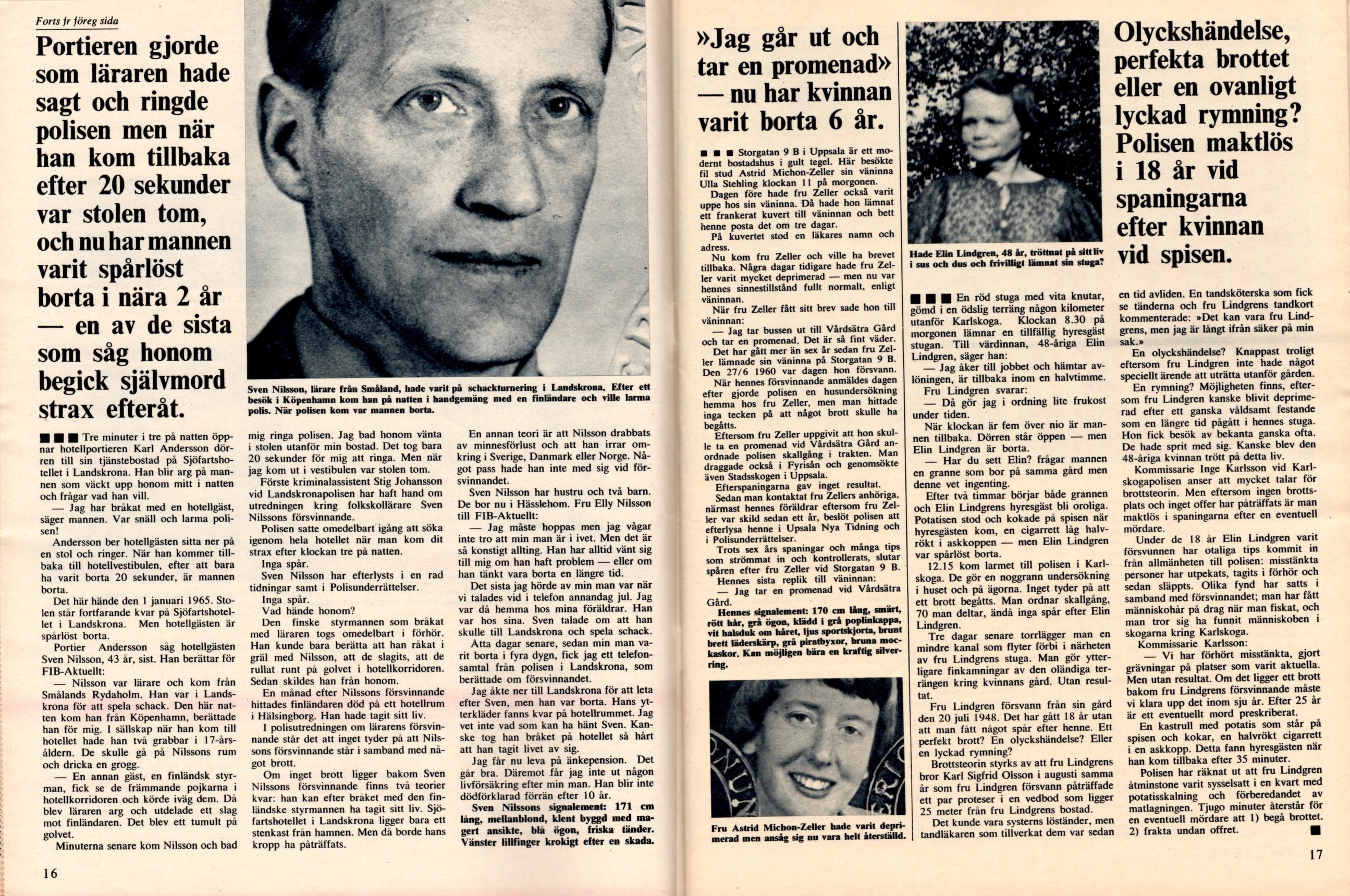 Nästa fall som tas upp är försvinnandet av läraren Sven Nilsson. Han var på besök i Landskrona där han stort sett gick upp i rök! Även här finns det lite mer info på flashback. Kortfattat tas fallet med Astrid Michon-Zeller som försvann spårlöst efter en promenad den 27:e juni 1960. En tråd på flashback finns om fallet.
