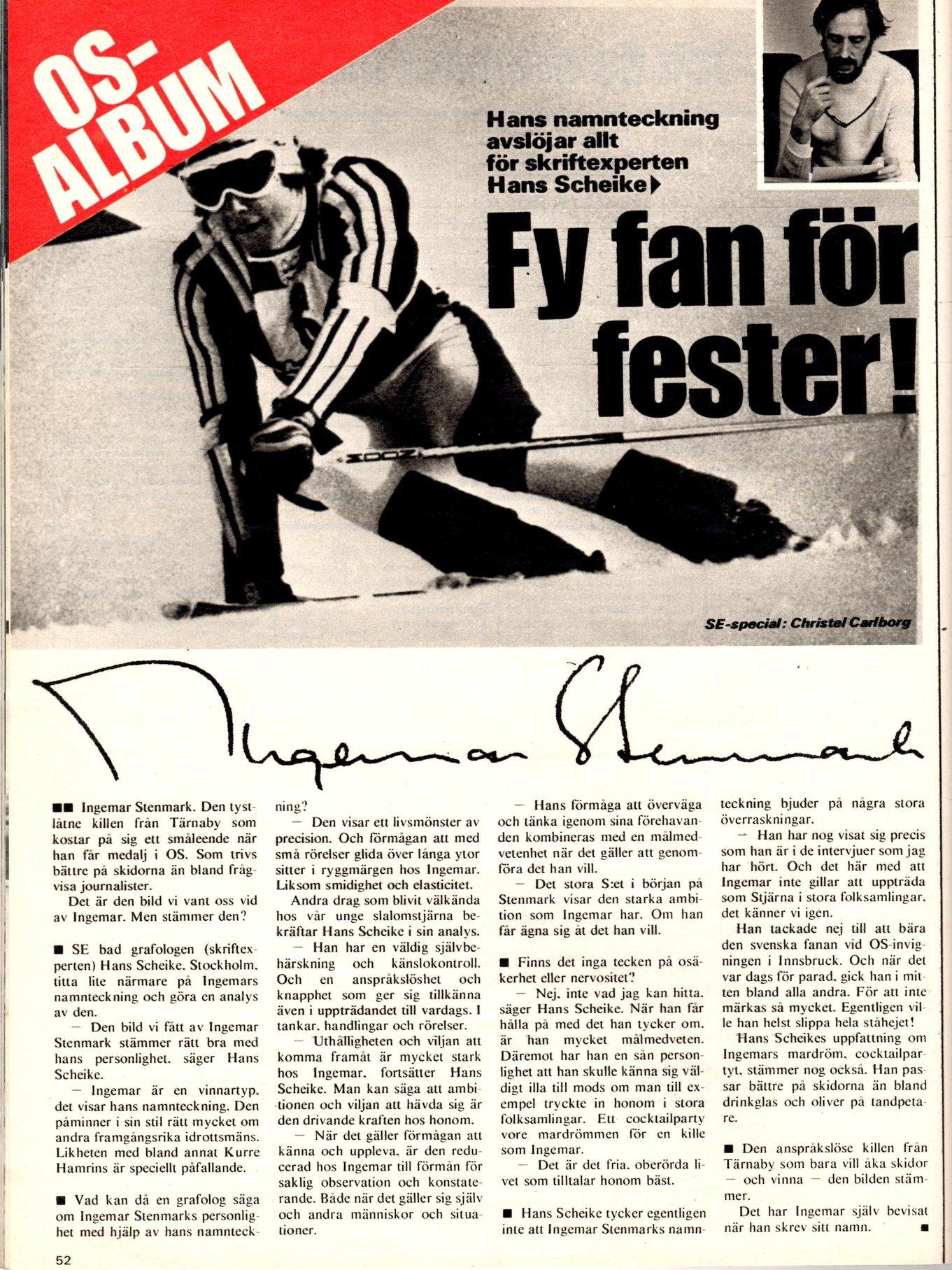 I denna artikeln så analyseras Ingemar Stenmarks namnteckning av en grafolog som berättar hur Stenmark ”är”. Guldkornet med denna historien är att grafologen är Hans Scheike! Mr rumpsmisk.