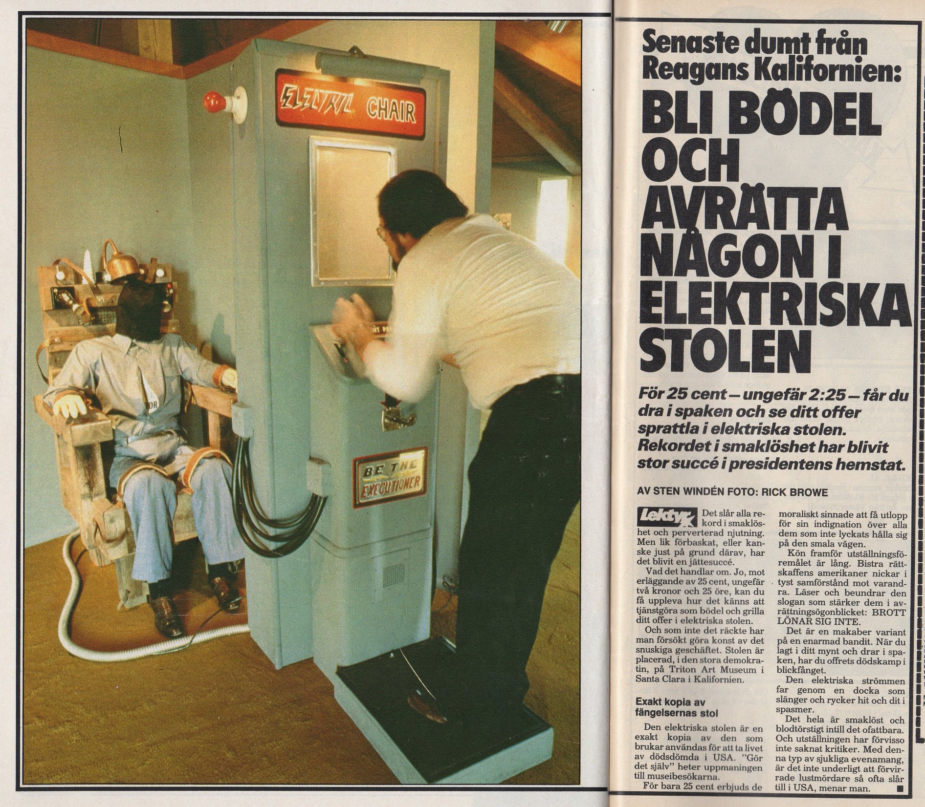 En härlig liten artikel i Lektyr nr 5 1985 om ett mynt-spel där man kan agerar bödel genom att ”avrätta” någon i elektriska stolen. Klassisk moralpanik eller osmakligt ”spel”, välj själv.