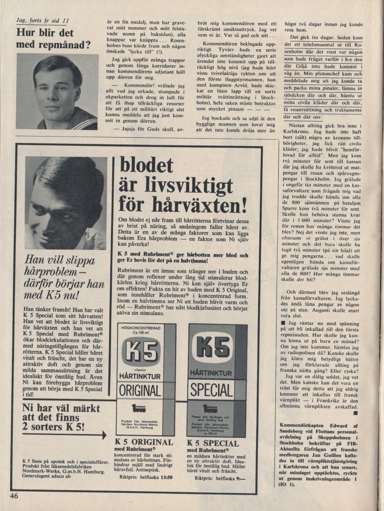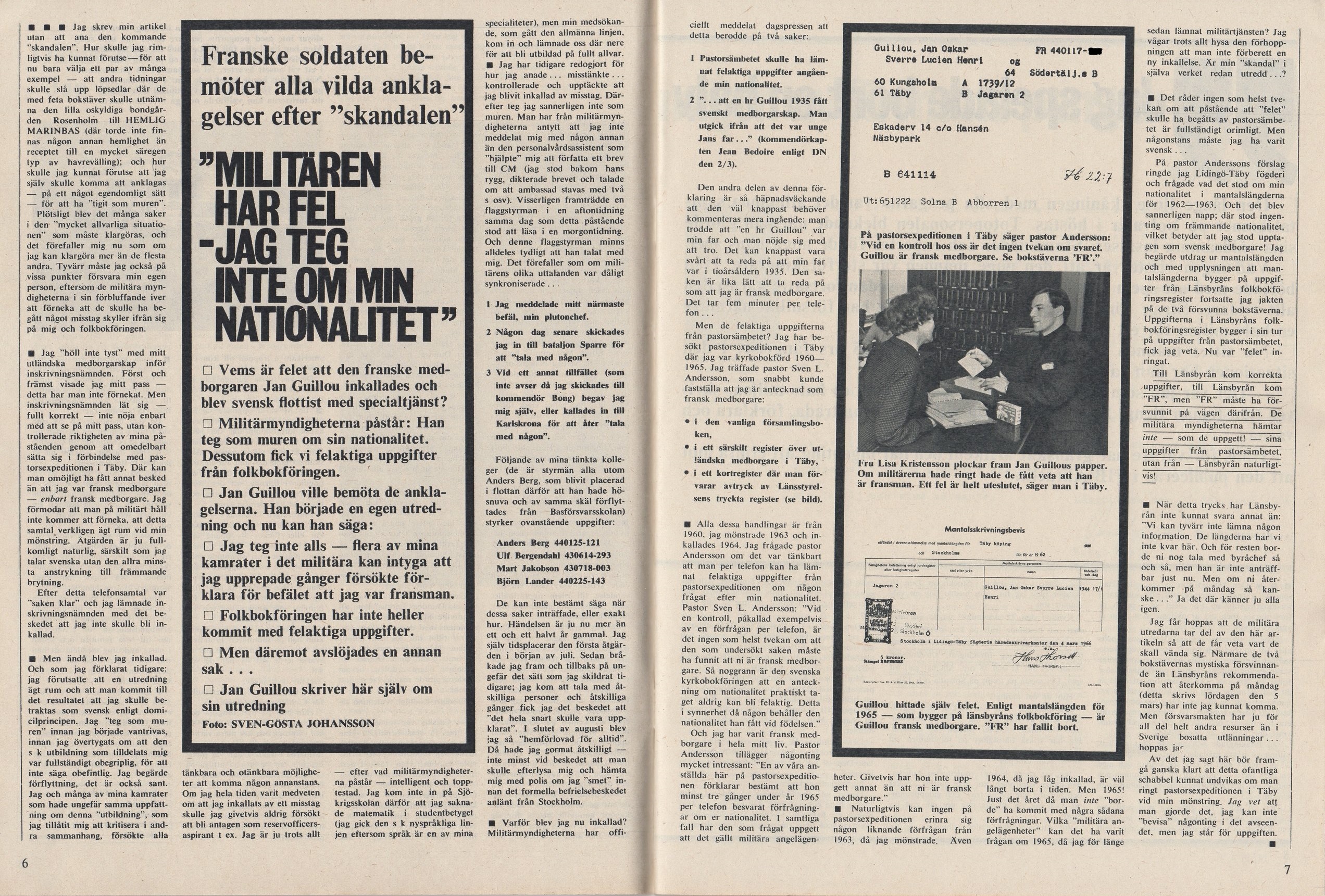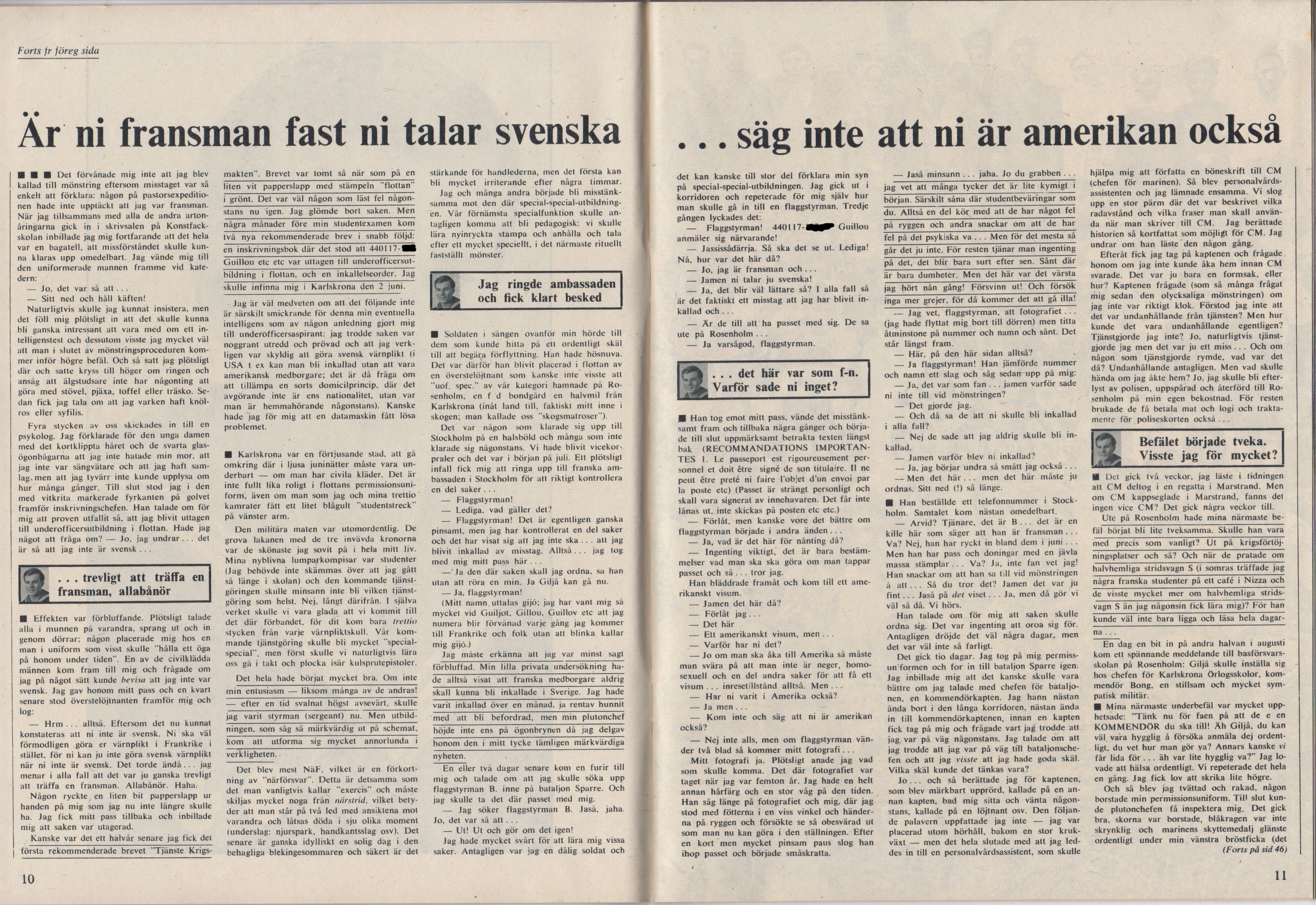 Jan Guillou behöver knappast någon presentation. Något som kanske inte alla vet är att Jan skrev en del artiklar i kulturtidningar såsom Lektyr och Fib aktuellt. De två artiklarna i detta inlägget är från Fib aktuellt nr 9 och 11 1966 och kan vara bland de första som Jan skrev som journalist. Själva artiklarna, hur Jan mönstra och blev svensk rekryt trots att han var fransk medborgare, är kanske inte det viktigaste som kommit på pränt näst efter bibeln. Men de är värda att dokumentera så andra än skumma herrtidningssamlare kan läsa och ta del av tidiga alster från Jan Guillous penna.