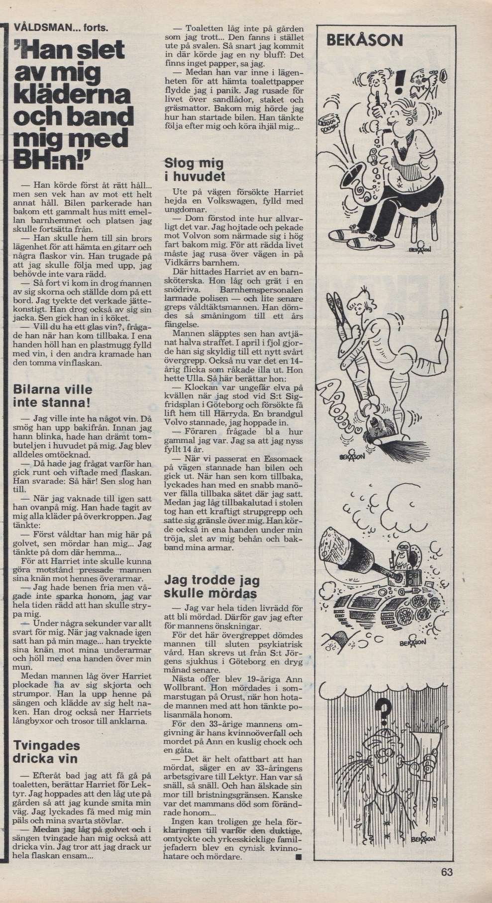 Drygt 2 veckor efter artikeln, den 24:e augusti enligt flashback, så upptäckte en person Ann livlösa kropp. Fyra dagar senare så grips gärningsmannen och efter förhör så erkänner han. I Lektyr nr 37 samma år, berättar tre kvinnor, Margareta, Harriet och Ulla, om deras tidigare möte med gärningsmannen. Hur han våldförde sig och hotade dem till livet. Harriet och Ulla var endast 14 år när det hände.