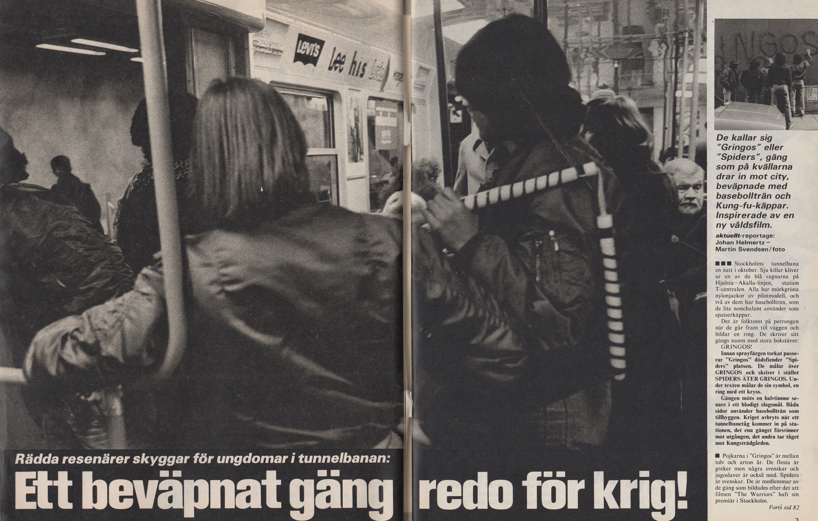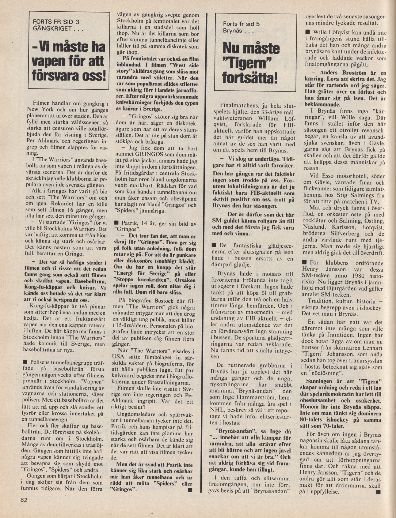 Här har vi en härlig artikel från Fib aktuellt nr 17 1980. Artikeln handlar om ungdomsgänget ”Gringos” i Stockholm som slåss med baseballträn och nunchucks mot andra gäng, bland annat ”Spiders”. Ungdomarna säger att de är influerade av filmen The Warriors, så vi får även med lite videovåldsmoralism.