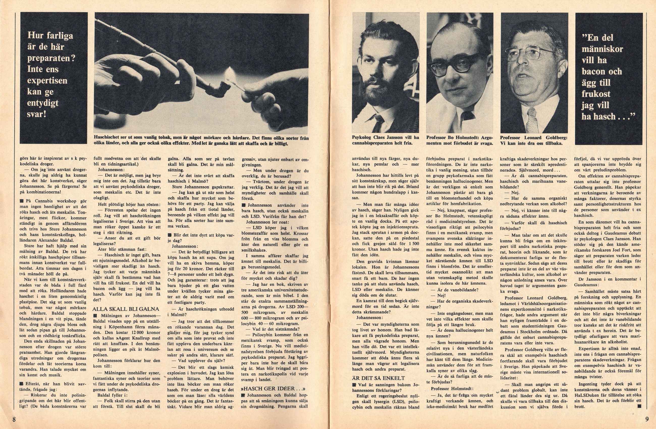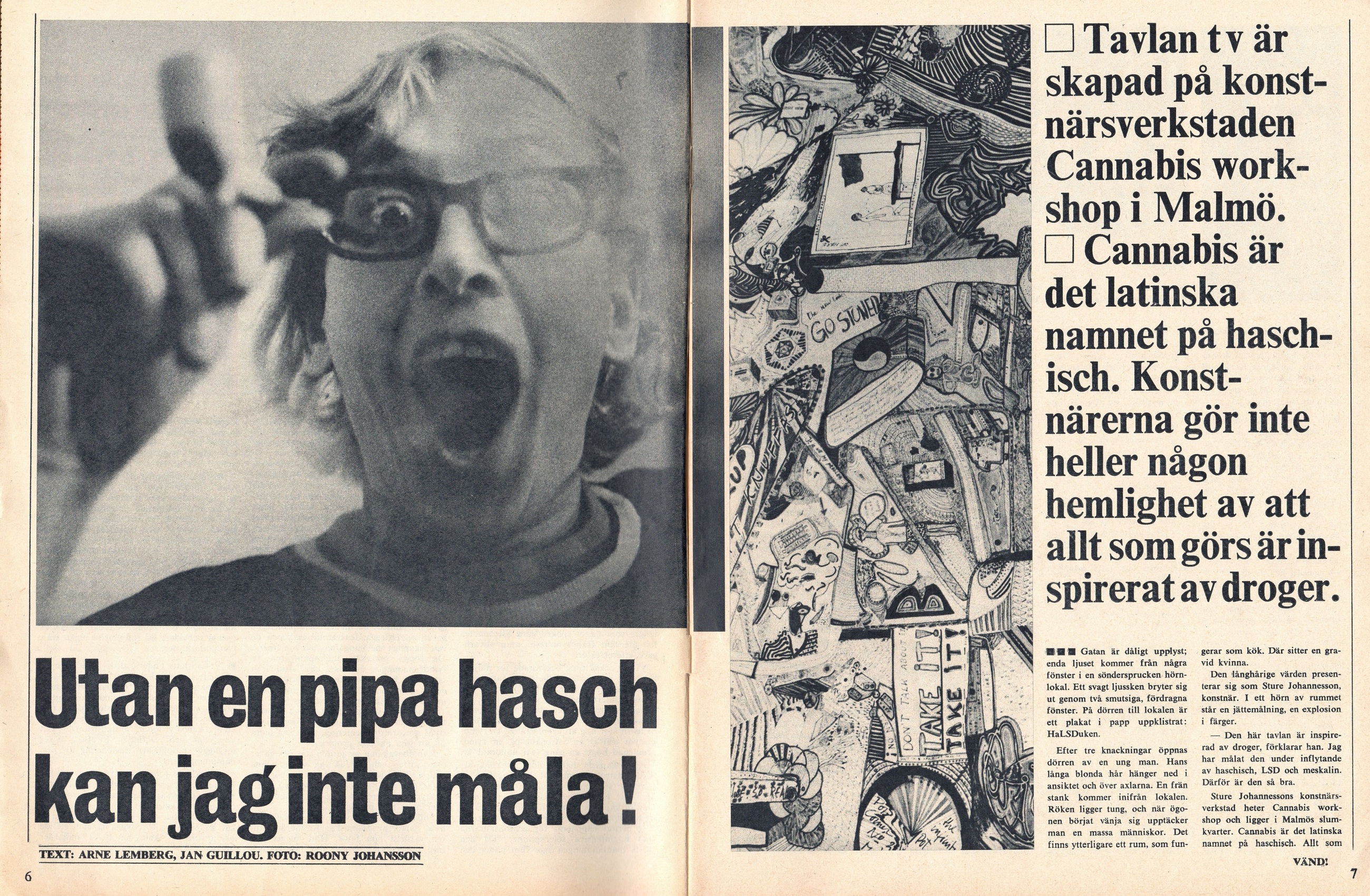 Här har vi en kul liten artikel från Fib aktuellt nr 3 1967. Journalisterna Arne Lemberg och Jan Guillou hälsar på i konstnären Sture Johannessons ateljé ”Cannabis workshop”. Där diskuterar de droger med den väldigt liberala konstnären. Med kommentarer som ”En del människor vill ha bacon och ägg till frukost, jag vill ha hasch” kan man inte misslyckas. Mycket nöje.