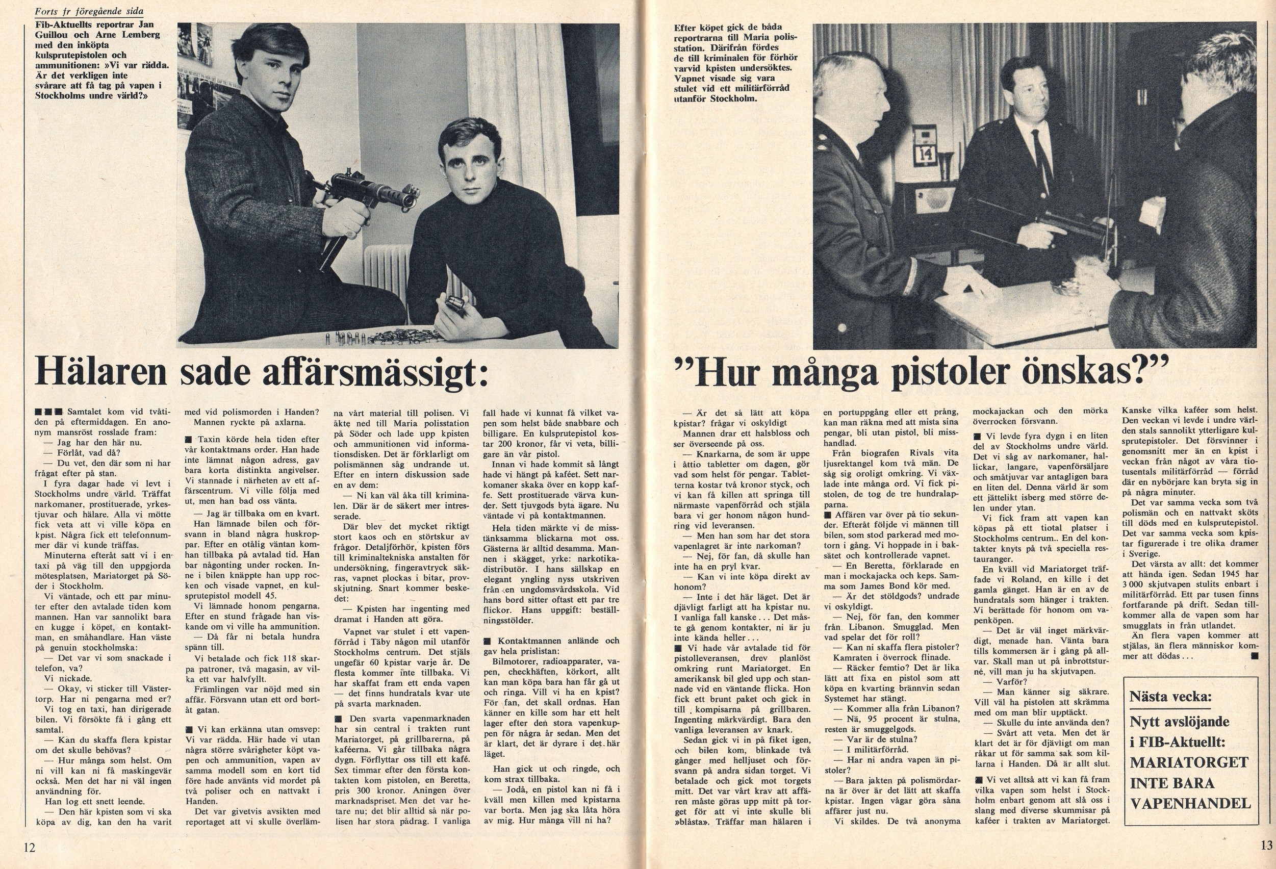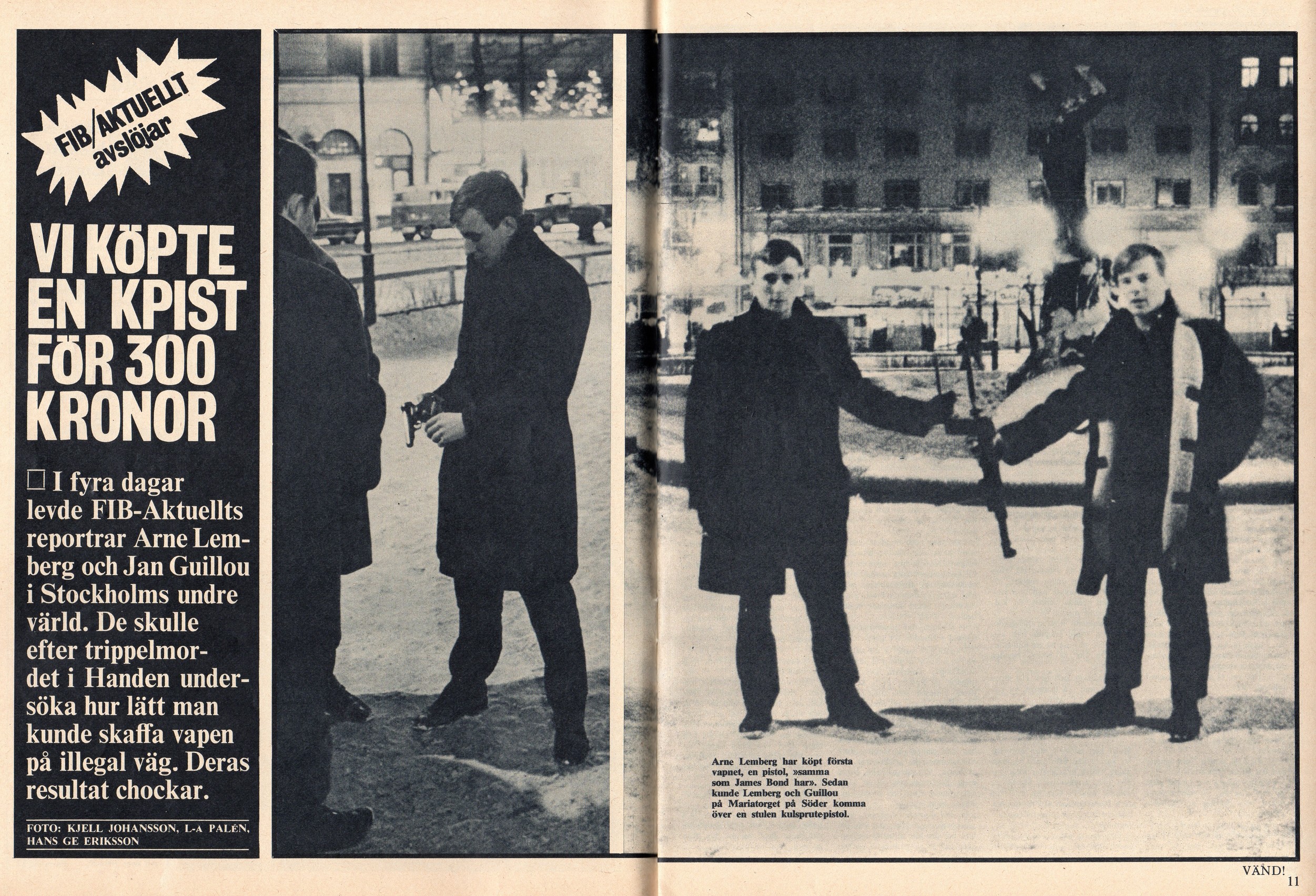Strax efter det fruktansvärda trippelmordet i handens centrum 1967 (jag lär återkomma till det brottet i framtiden), där två polismän och en vakt blev brutalt mördade, så testade den journalistiska duon Lemberg och Guillou hur svårt eller lätt det var att få tag på en kpist. I deras artikel, publicerad i den feministiskt initiativ stämplade kulturtidningen Fib aktuellt nr 4 1967, så får man läsa om deras 4 dygn i Stockholms undre värld och hur lätt det var att få tag på kpistar och andra vapen.