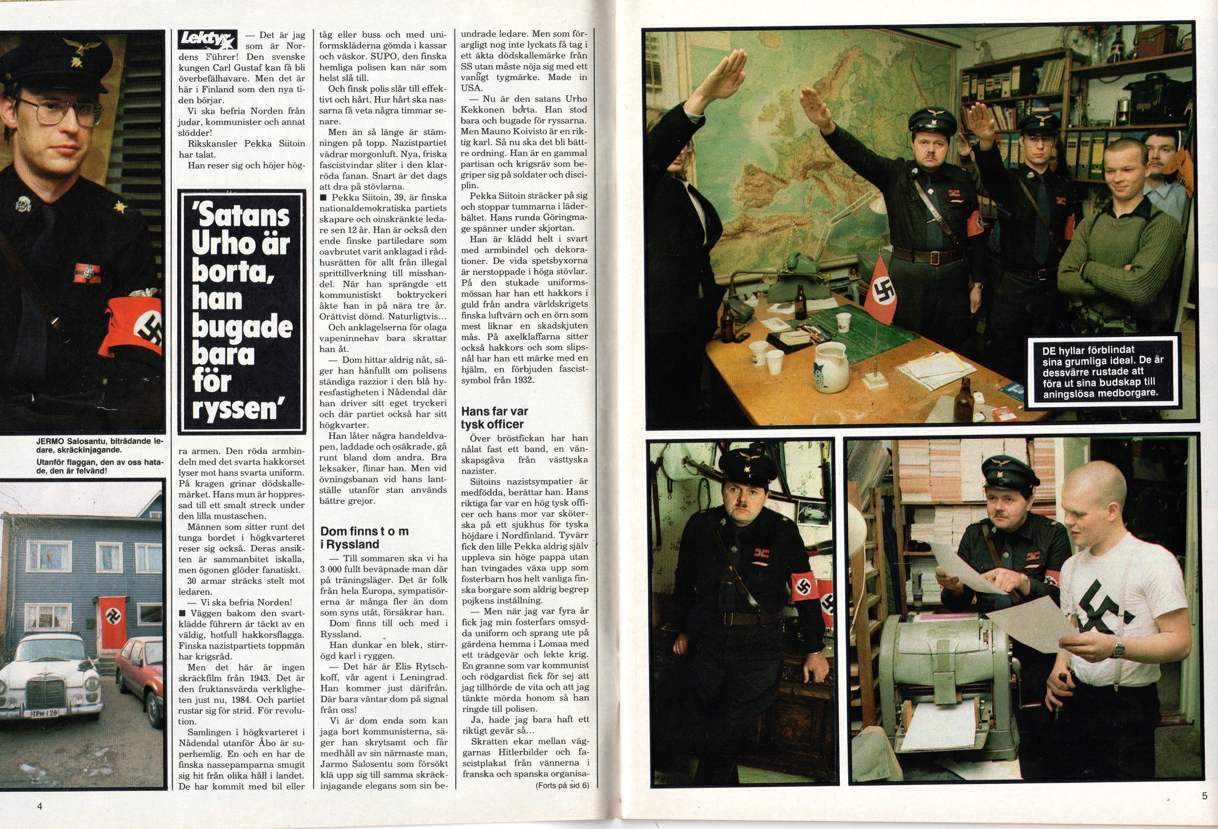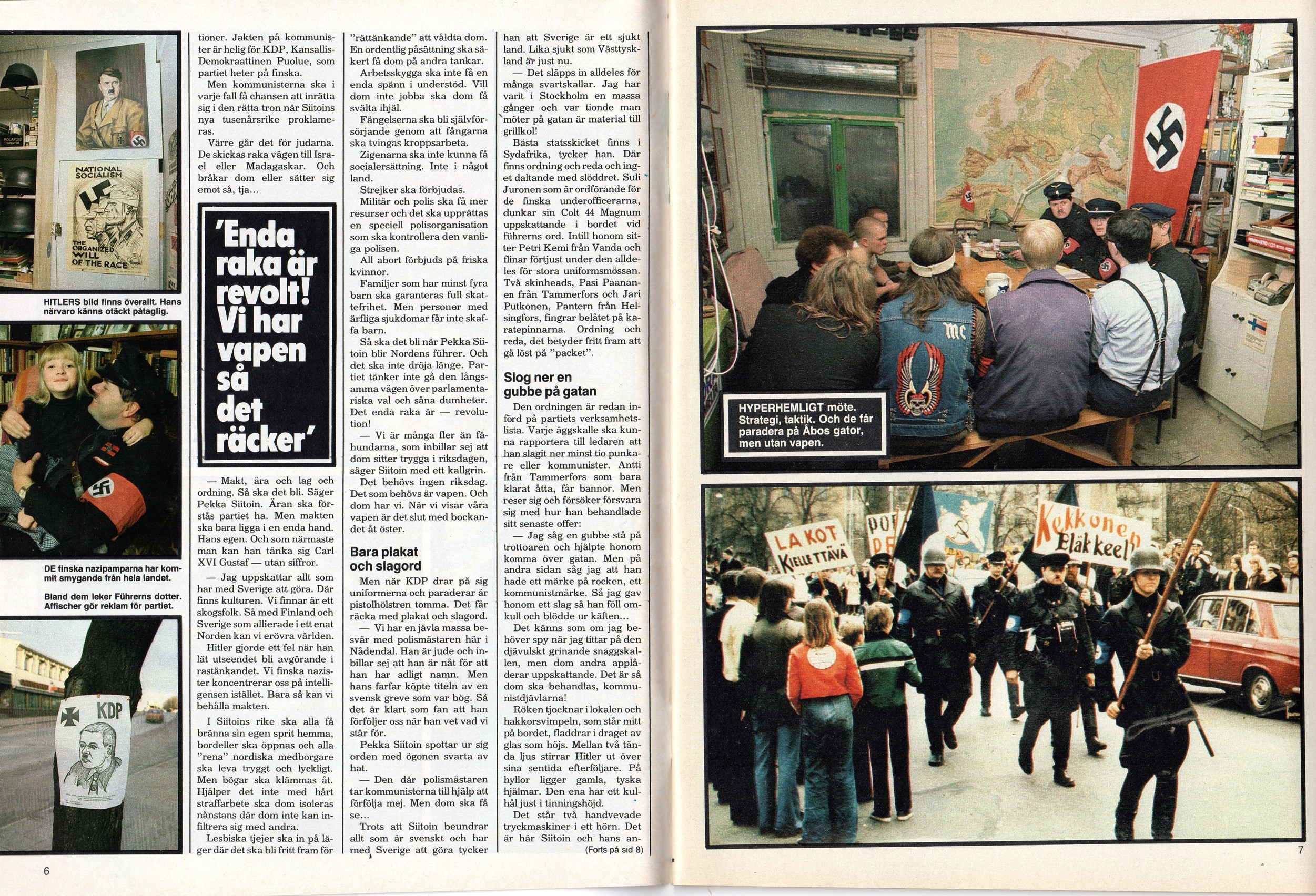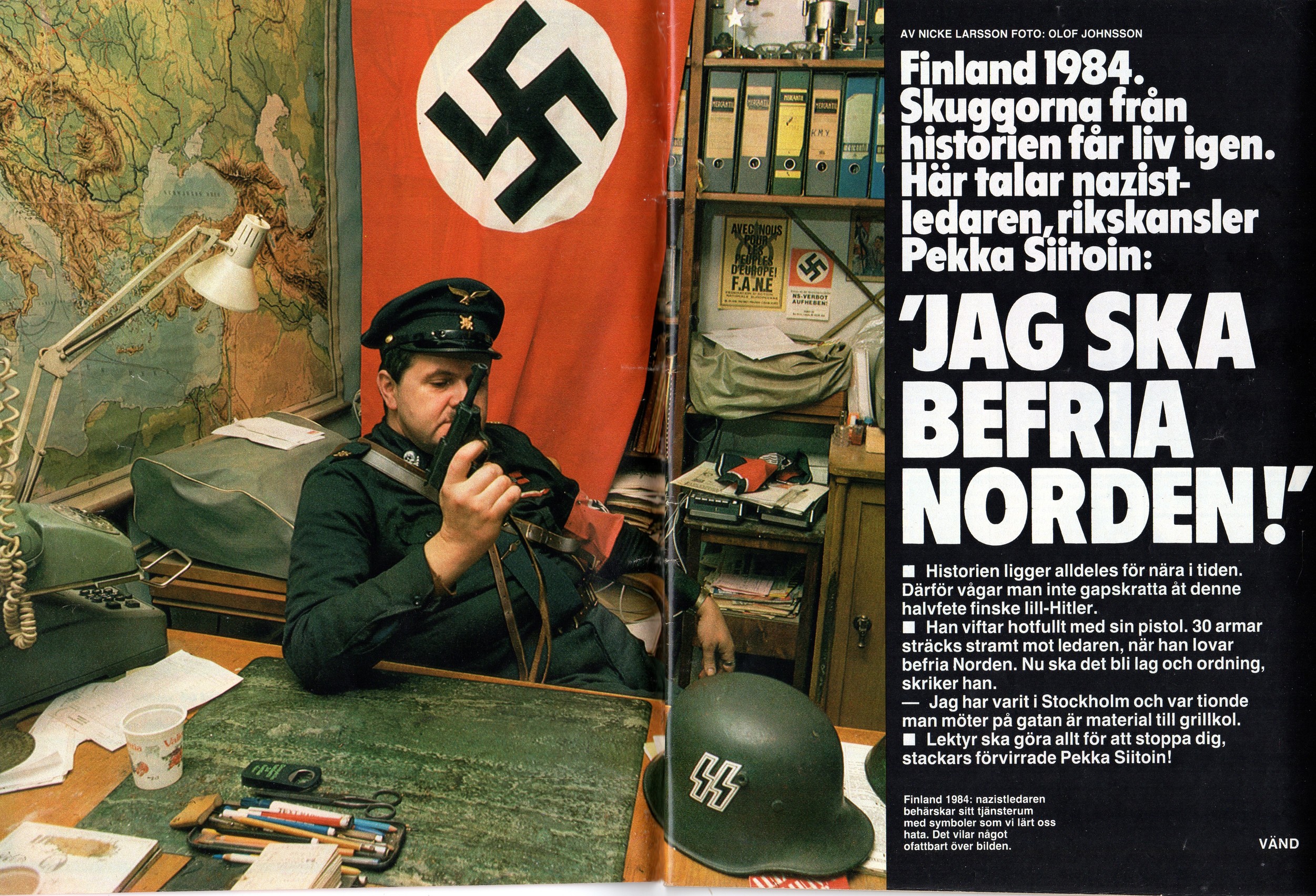Jag kan verkligen rekommendera att ni ser hela dokumentären (i alla fall minst klippen med Pekka) efter ni läst den utmärkta artikeln från Lektyr nr 4 1984. Journalisten Nicke Larsson och fotografen Olof Johnsson (många fina och stolliga bilder) är och hälsar på Pekka Siitoin i hans högkvarter i Nådendahl utanför Åbo, Finland. En artikeln som börjar med ”Jag har varit i Stockholm och var tionde man möter på gatan är material till grillkol!” är klassisk herrtidningsmaterial.