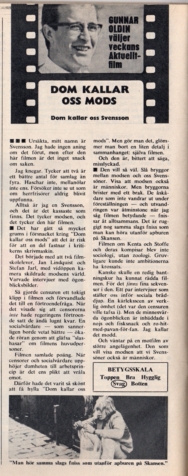 Filmrecensenten i Fib aktuellt, Gunnar Oldin, var inte så imponerad av filmen. I nr 16 1968 så ger han betyget ”svag” till ”Dom kallar oss mods”.