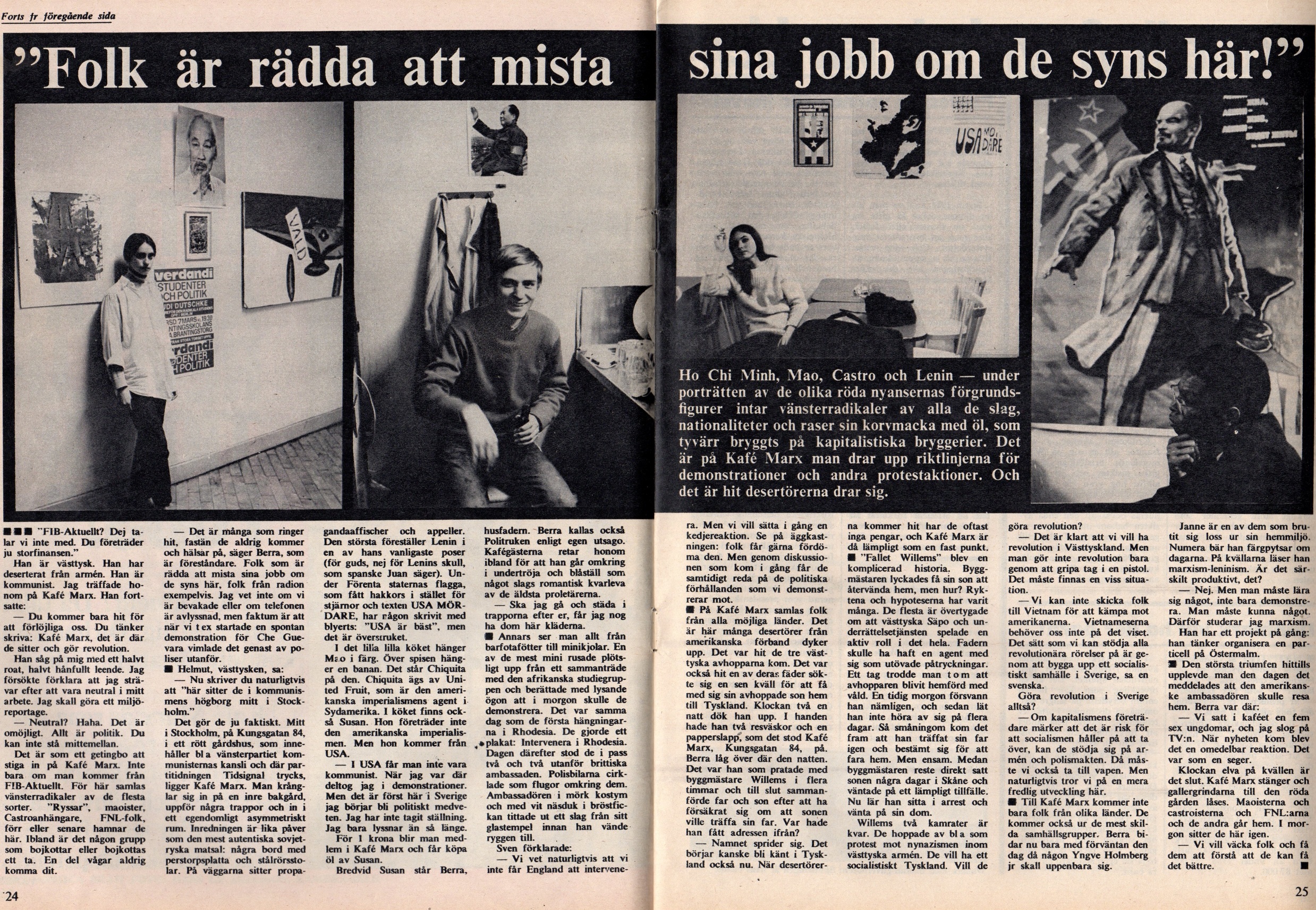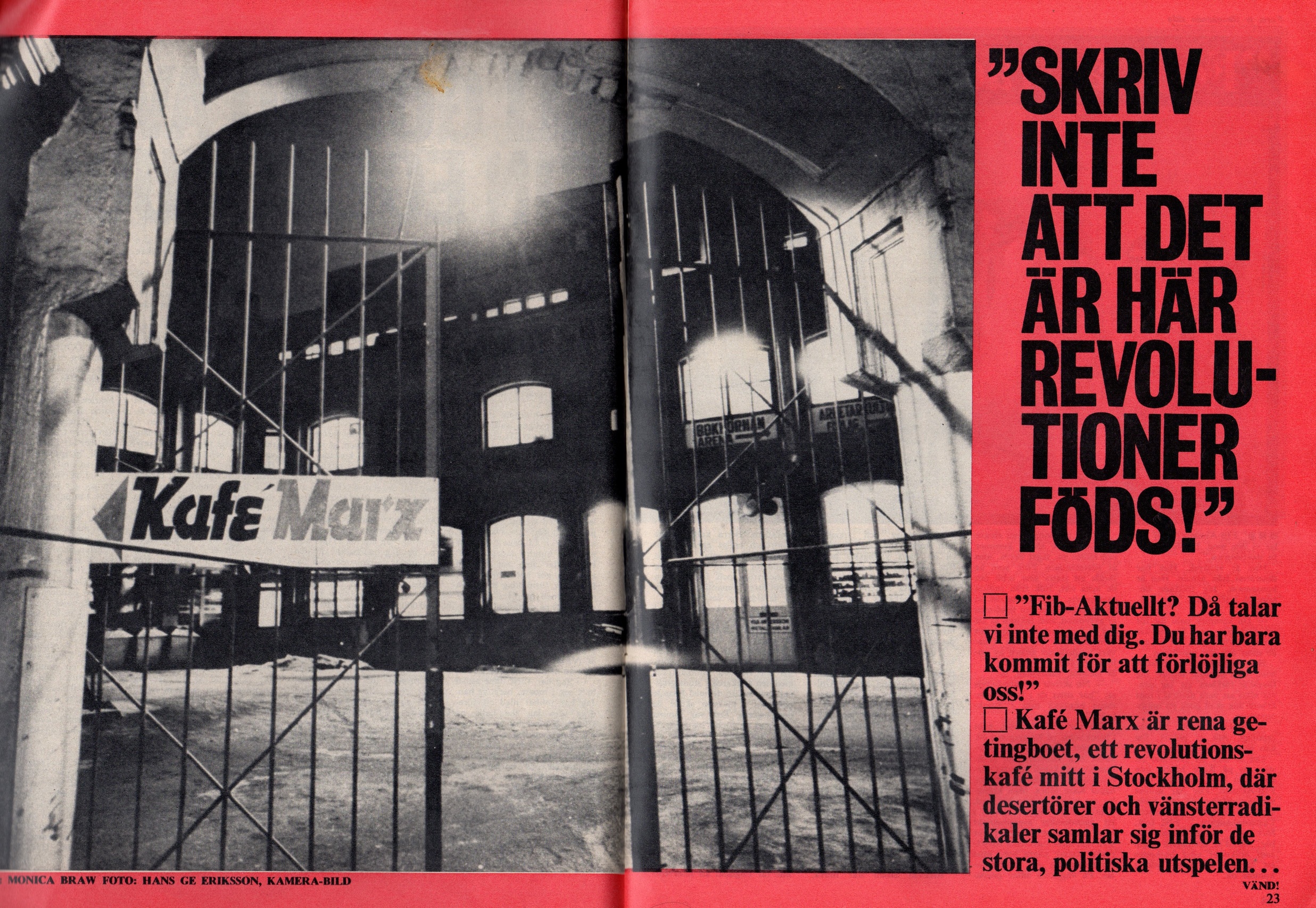 I nr 13 1968 så besöker Fib aktuellts journalist Monica Braw Kafé Marx mitt i Stockholm. Ett rätt intressant, men kort, tidsdokument. Kaféet finns kvar än idag, på samma adress.