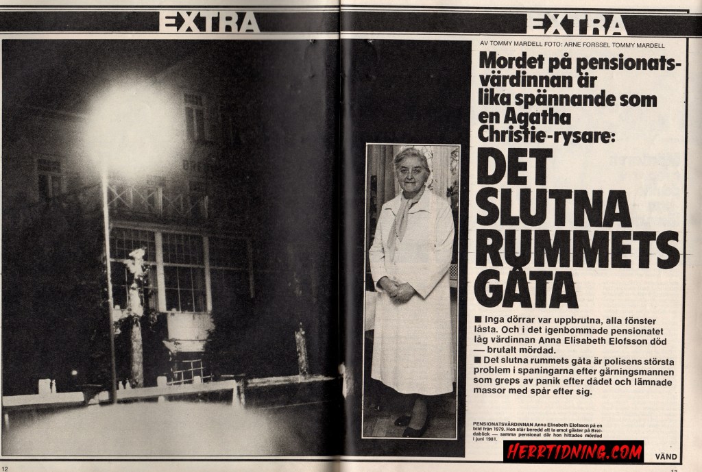 1981 så var 71-åriga Anna Elofsson pensionatsvärdinna på Breidablick. Elofsson hade på sistone känt sig rädd och illa till mods och hade den aktuella kvällen (24:e juni) ringt Sten Brinzen 74 år, som tidigare jobbat som gårdskarl, om att han skulle komma och ligga över på pensionatet, vilket han gjorde.