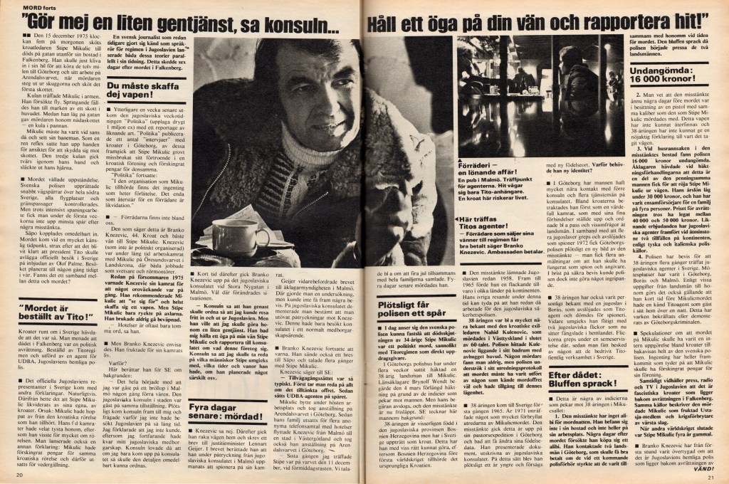 […] Morgonen den 15:e december 1975 vaknade Mikulic vid halv fem, tvättade sig, kokade kaffe och sa adjö till sin fru för att gå ut till sin Volvo 145 och åka till jobbet på Arendalsvarvet i Göteborg. Men väl ute vid bilen så mötte han sina banemän dog av två skott i huvudet. En granne, Bror Mårtensson blev vittne till mordet när han var ute för att ta in tidningen. Han såg dock inte mördarna. Det 65-åriga tidningsbudet Rudolf Johansson mötte strax efter skotten en vit Amazon som polisen trodde var bilen som mördarna använde. […]