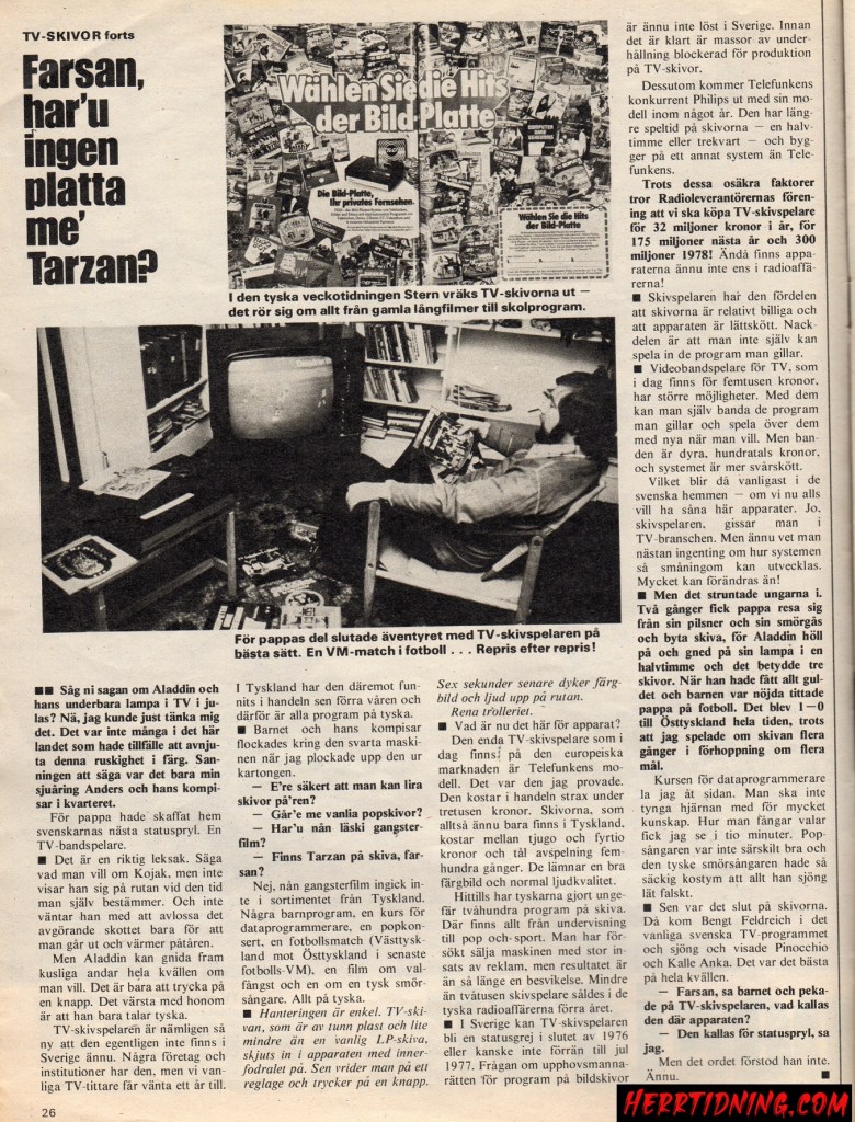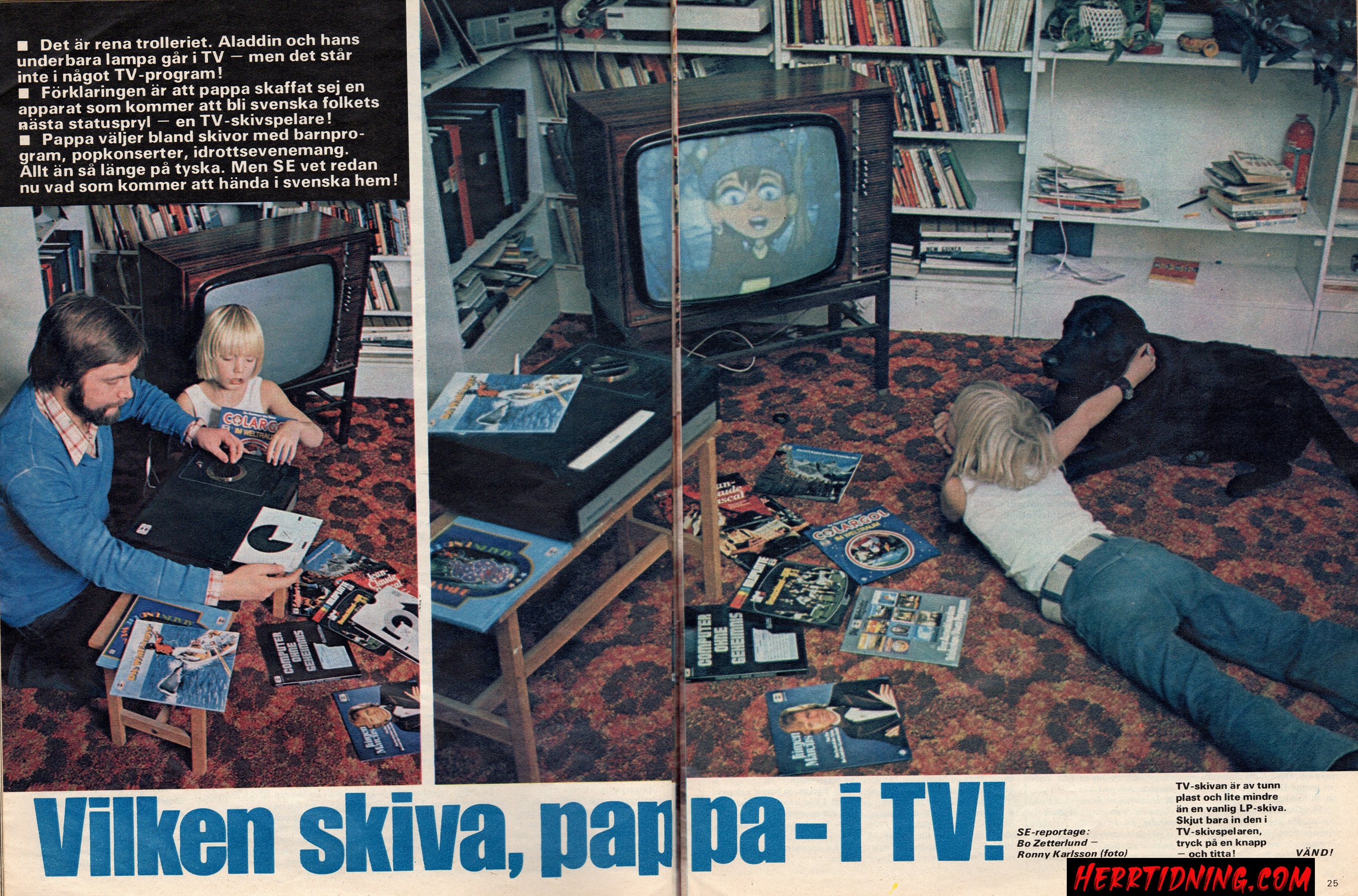 Ibland så hittar man en fantastisk artikel som man inte räknat med när jag bläddrar mina gamla herrtidningar. Som journalisten Bo Zetterlund artikel i tidningen Se nr 2 1976 om det framtida TV-skivspelaren från Telefunken, TeD (Television Electronic Disc). Ett format som annonserades redan 1970 av Telefunken och Teldec. Då kunde detta 8 tums skivsystem bara lagra 5 minuter per skiva. När formatet introducerades på tyska marknaden 1975 så hade man dubblat speltiden till 10 minuter per skiva. Mer info om formatet finns på Wikipedia. Finns även ett par intressanta videos på youtube man kan kolla på.