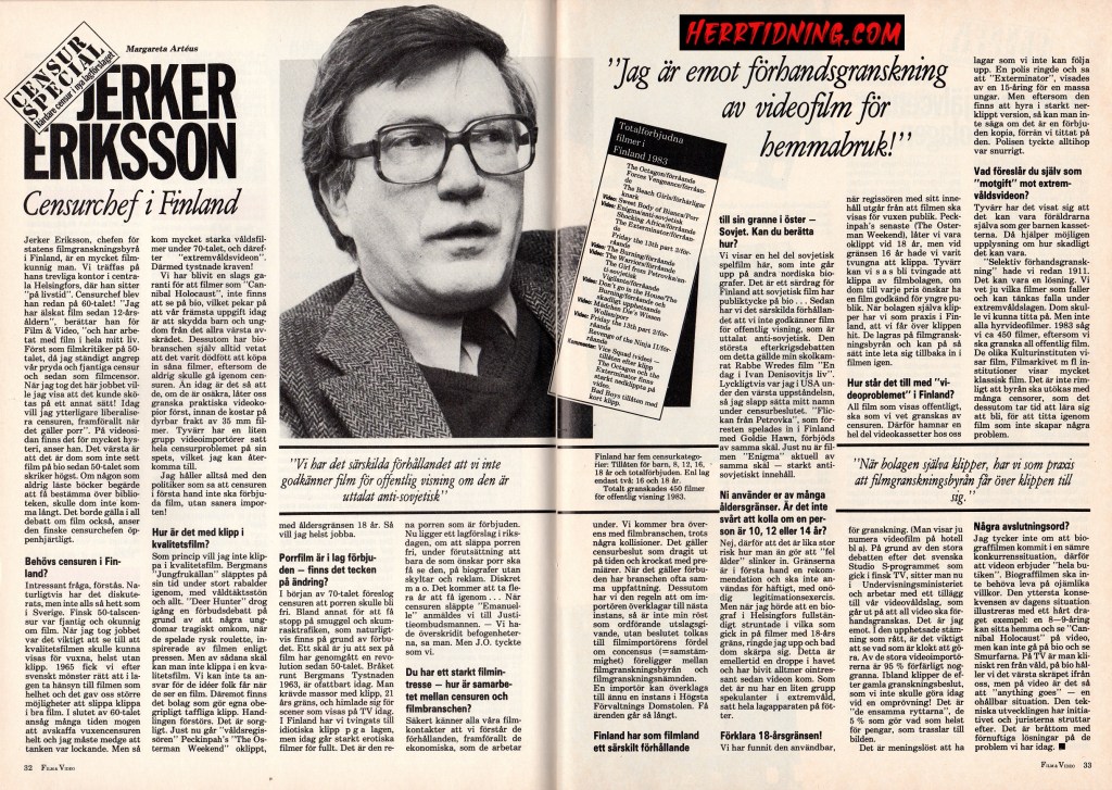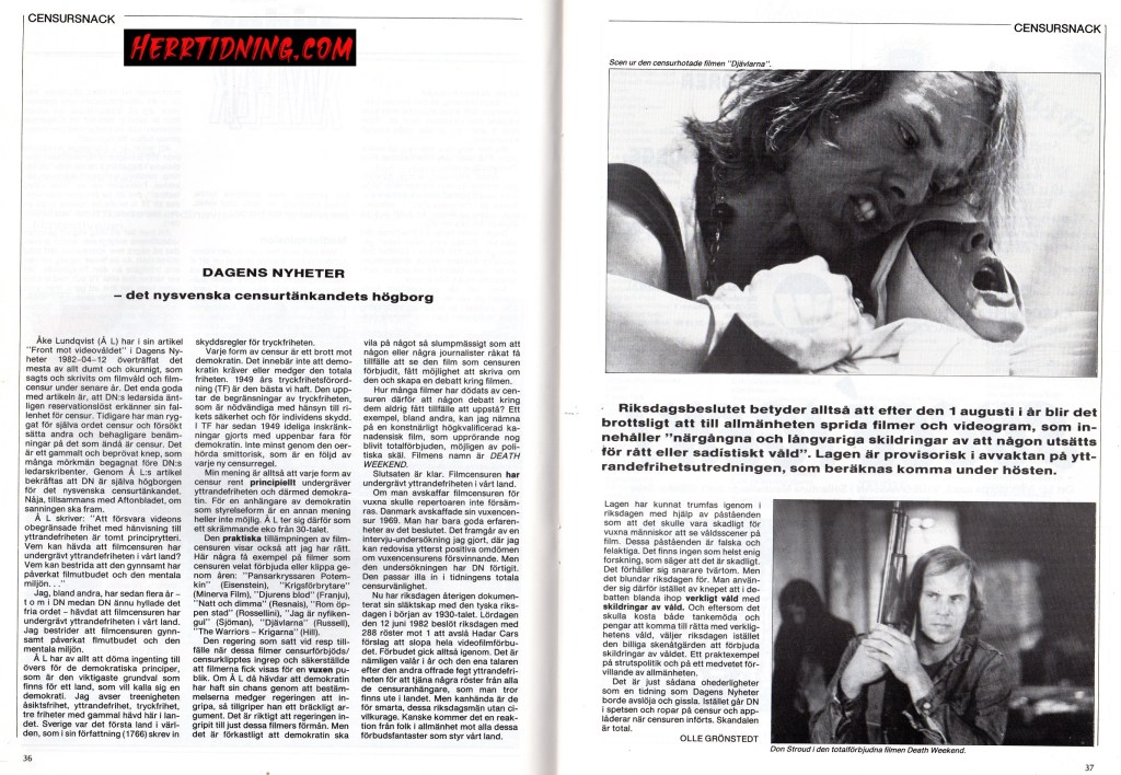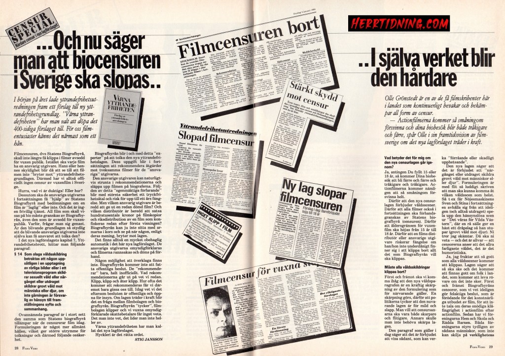 Något som jag själv är väldigt intresserad av är censur av ord, musik, film etc. Jag är helt emot censur. Det har inget i ett demokratiska land att göra. Därför är det lite av en julafton att läsa en gammal gedigen artikel från (Scandinavian) Film & video nr 2 1984 som tar upp problemet med film och videocensuren när videon var ny. Det jag inte kan förstå är de personer som skrattar åt alla dumheter om att censurera hårdrock, videofilmer, TV-spel etc från förr men som själva vill censurera eller stoppa något idag. Lär ni er inget av historien? Folk kommer skratta åt ER i framtiden.