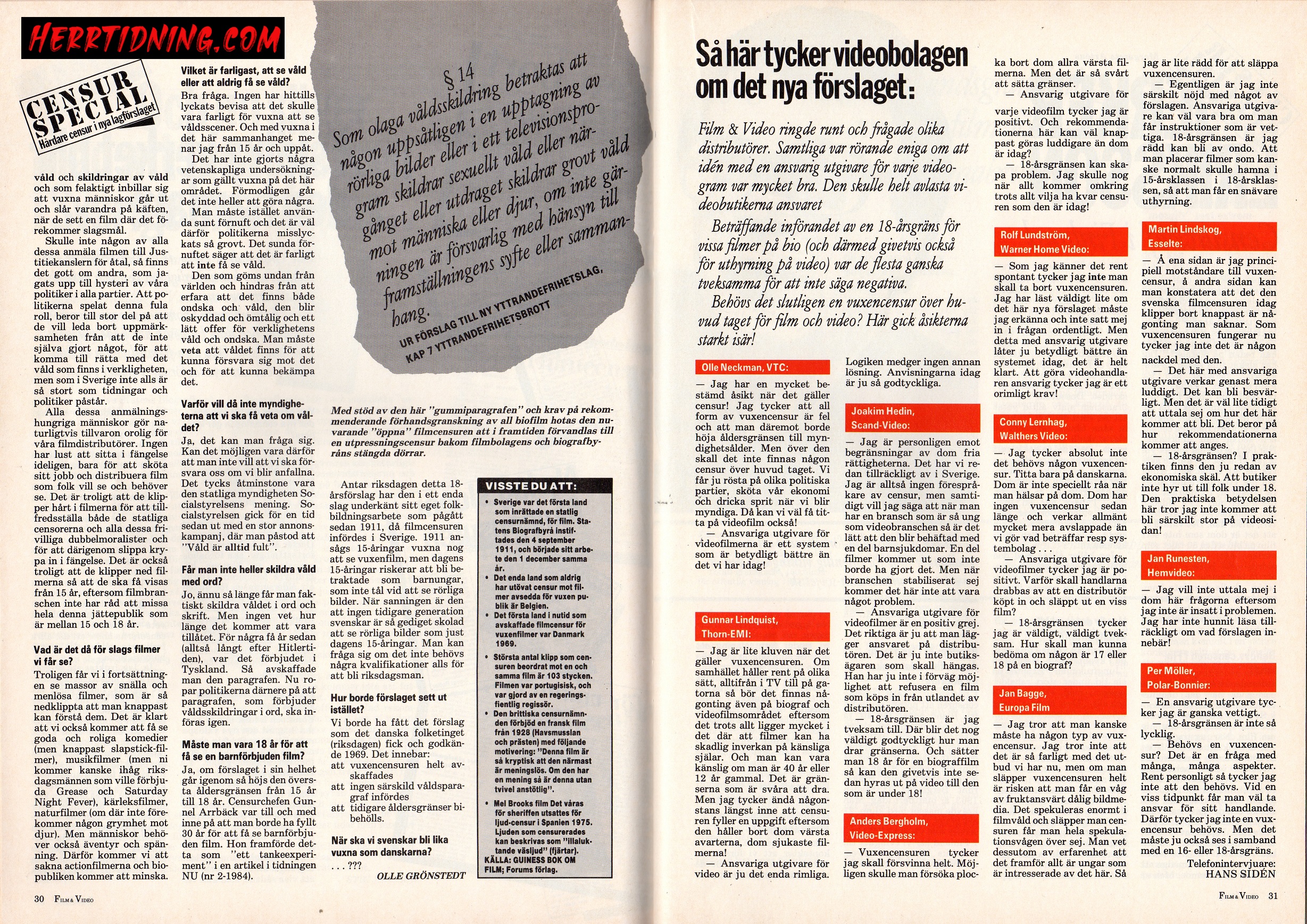 Sen tar man upp det nya förslaget från yttrandefrihetsutredningen om en ny yttrandefrihetsgrundlag som Grönstedt anser inte är en förbättring utan snarare tvärtom. En kul detalj är när Film & video frågar svenska filmdistributörer vad de anser om censuren.