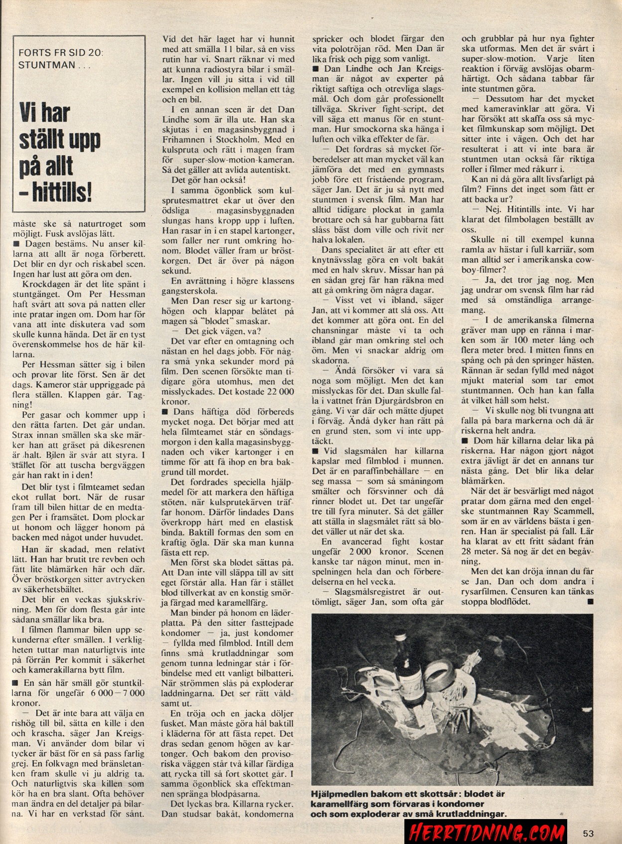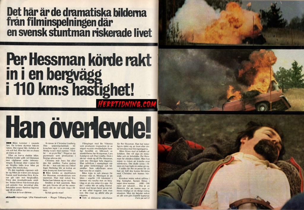 Jag har tidigare publicerat en artikel från Thriller – en grym film som jag kan rekommendera att man läser. Artikeln här är från Fib aktuellt nr 2 1973 där journalisten Ulla Hasselmark snackar med stuntteamet bakom Thriller – en grym film om hur de jobbar. Vi får veta att killen som gör bilkraschen är Per Hessman, en damfrisör (!) som extraknäcker som stuntman. Samma Hessman skall senare både spela en roll och vara en stuntman i Mats Helge Olssons ”I död mans spår” samt spela en roll i Olssons försvunna film The Frozen star.