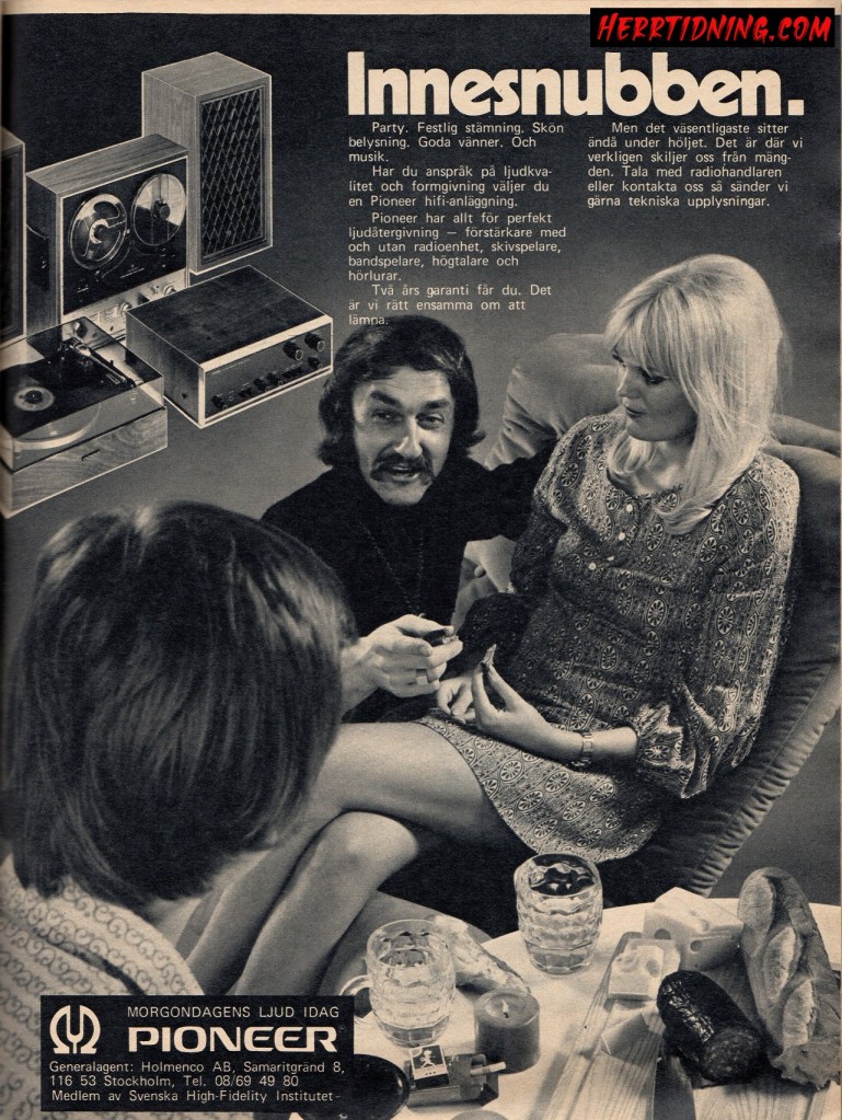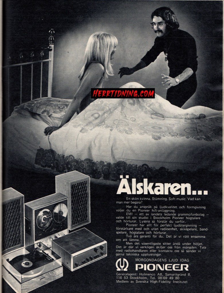 Nu till bonusen. Reklam från förr är inte som reklam nu för tiden. Speciellt under 60- och 70-talet så var det rätt galet och kul. Som Pioneers reklamserie i slutet av 1970 där de lyfte fram sina stereoprylar för ”innesnubben”, ”befriaren” och ”älskaren”.