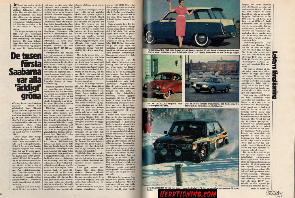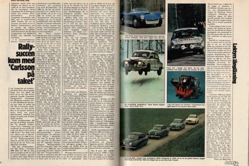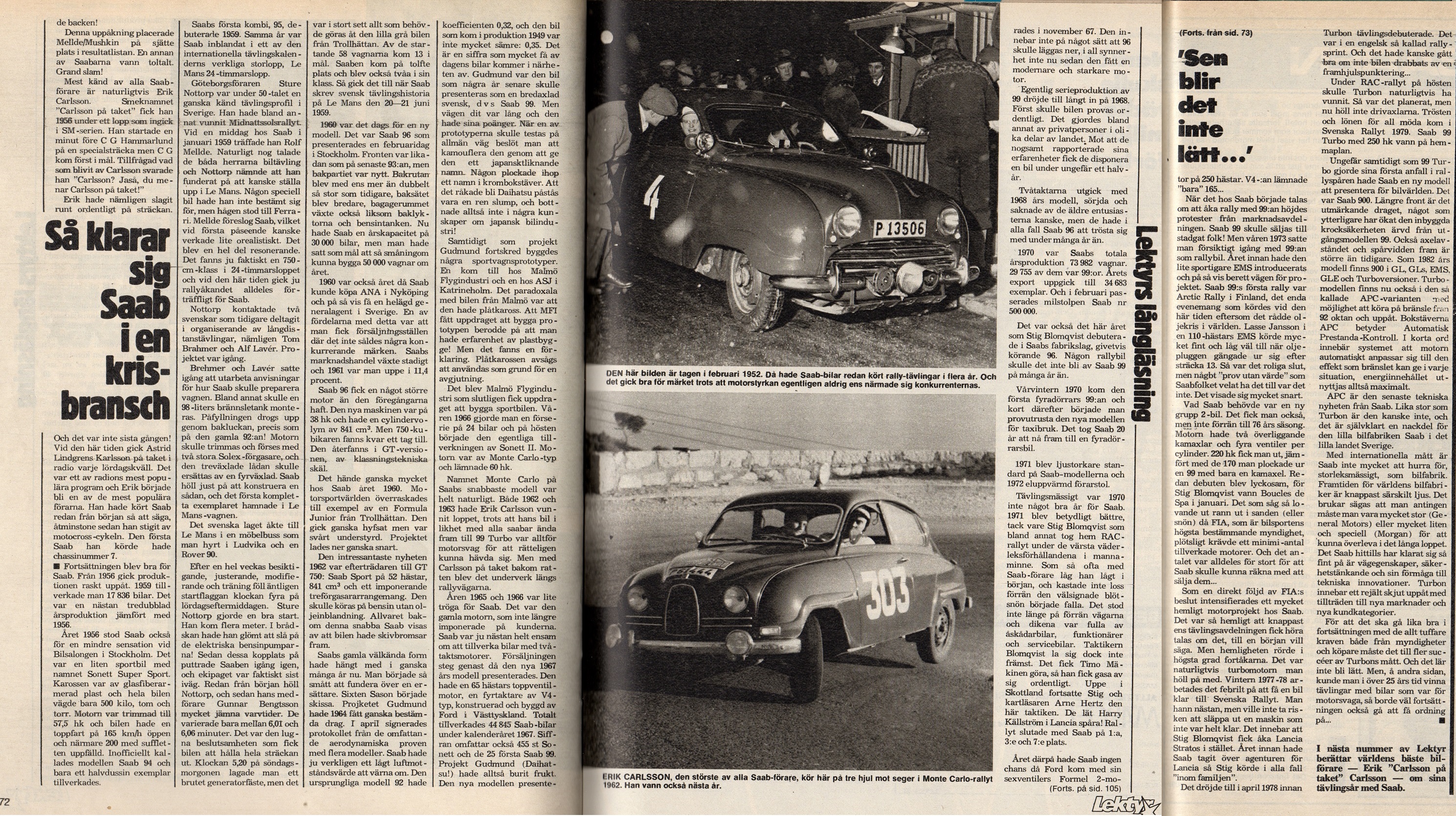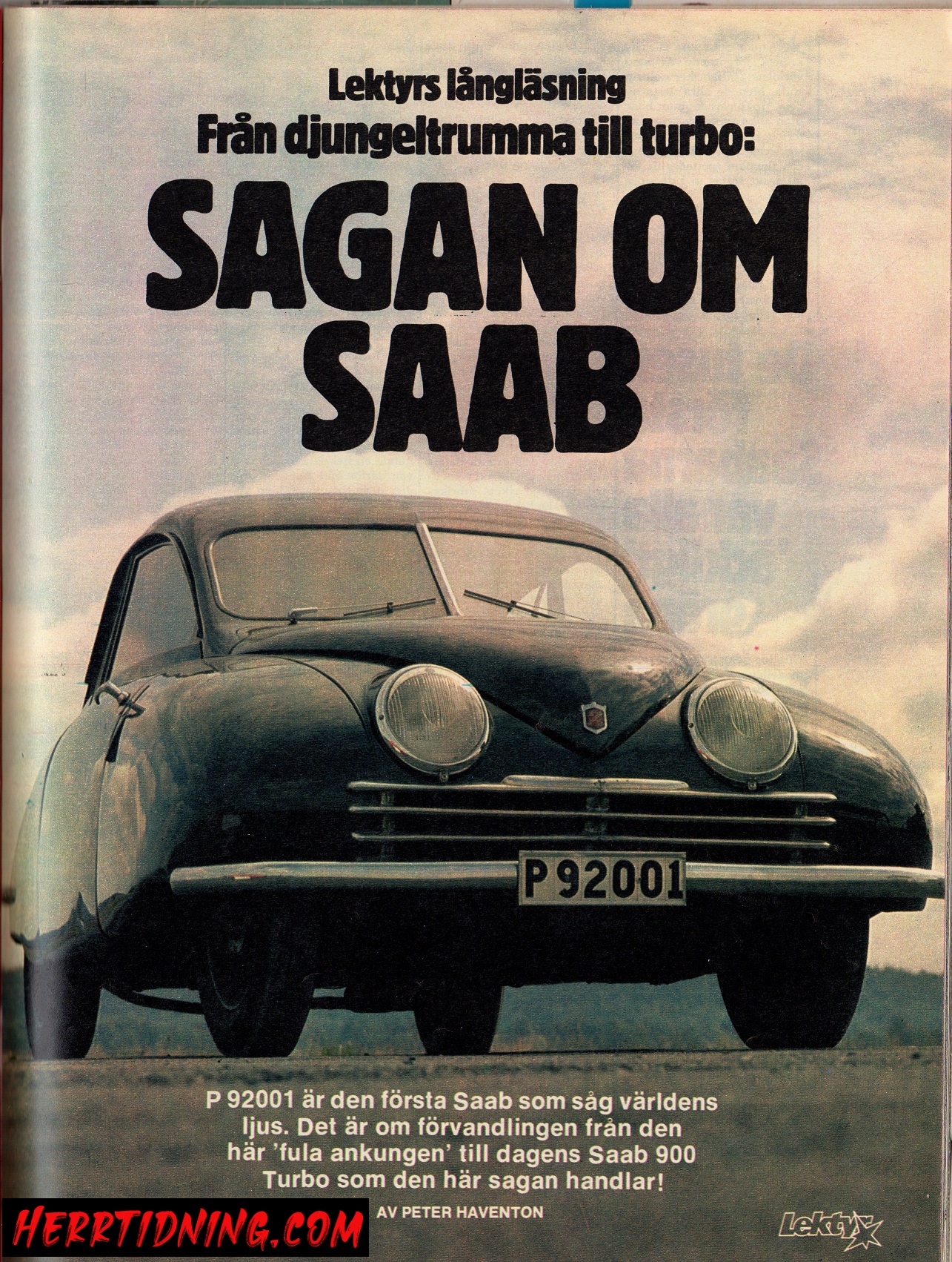I Lektyr nr 4 1982 så ger oss journalisten Peter Haventon en intressant artikel om biltillverkarens Saabs historia fram tills dess. 92, 95, 99, 900, Stig Blomqvist, Carlsson på taket med mera. Perfekt läsning till söndagens varma mackor och iskall pucko.