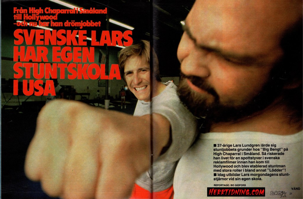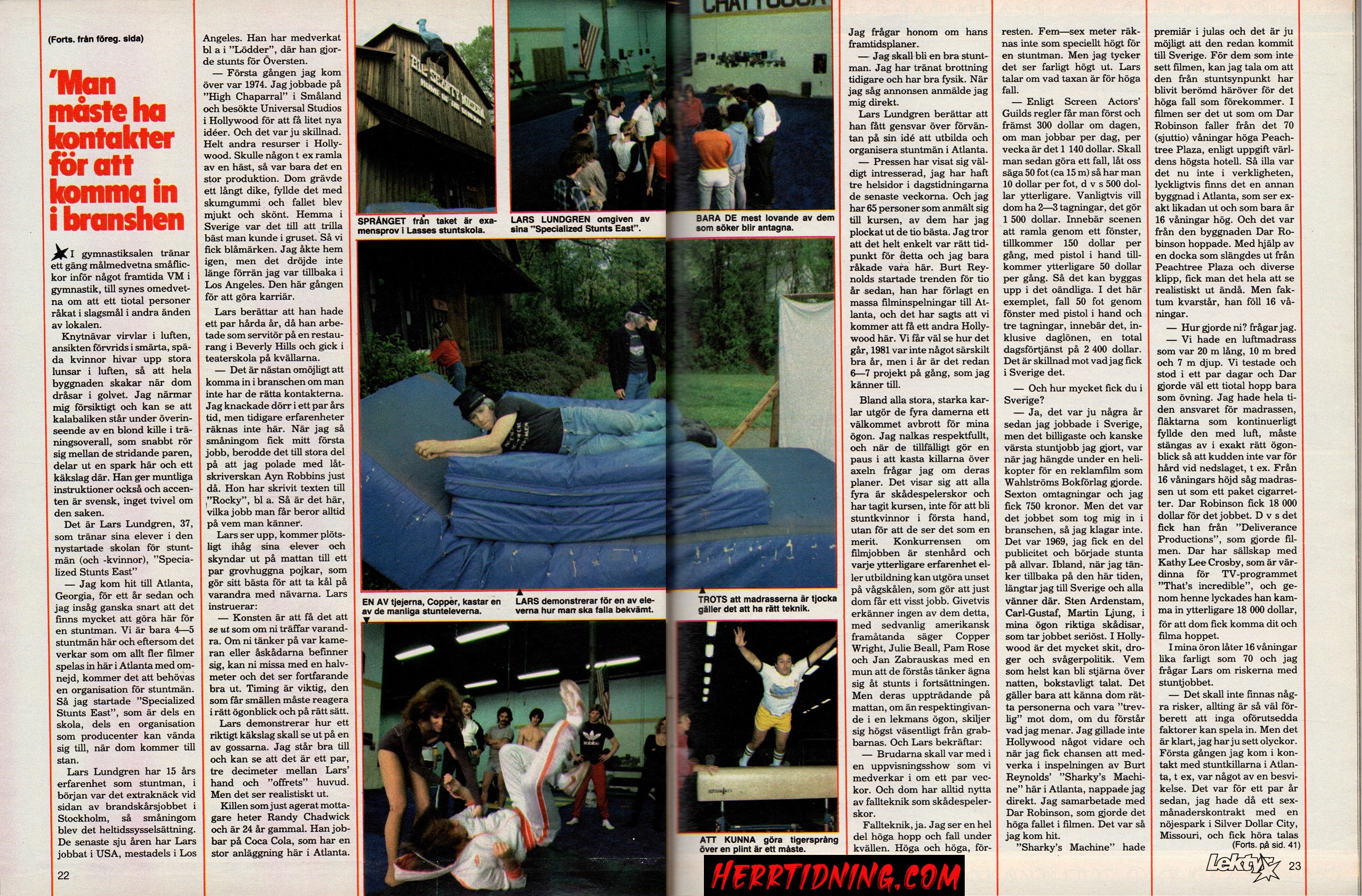 Drygt 10 år senare så besöker Lektyr i nr 34 1982 Lars Lundgren i Atlanta, USA, där han lär upp en ny generation stuntmän i sin skola, Specialized stunts east. Det är ett intressant samtal med journalisten Bo Gidfors där Lars berättar sin syn på Hollywood, skillnaden att göra stunts i USA och Sverige och när han hjälpte Dar Robinson att göra det klassiska fallet i Burt Reynolds våfflan Sharkey’s machine.