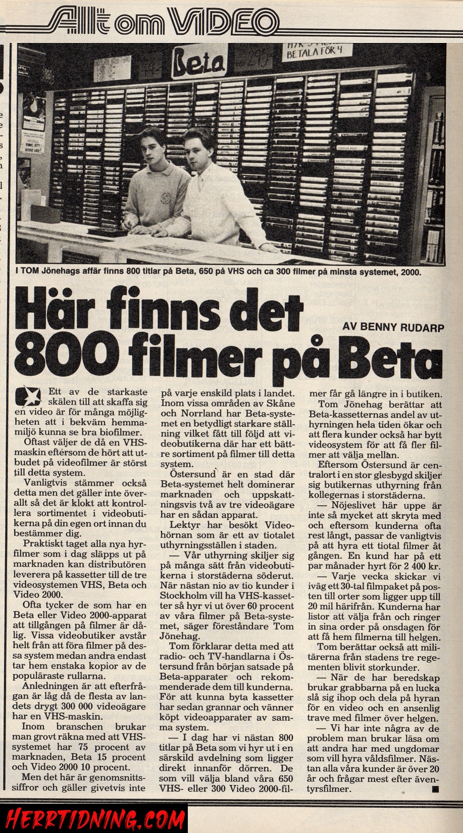 Men i Östersund så var det inte VHS som dominerade i början av 80-talet. Lektyrs journalist Benny Rudarp besöker videobutiken videohörnan i Östersund. Hos videohörnan så dominerar betamax, där butiken har ca 800 titlar på betamax, 650 st på VHS och 300 st på video 2000. Rudarp talar med föreståndaren Tom Jönehag om varför så är fallet. Artikeln publicerades i Lektyr nr 16 1982 under deras ”allt om video” del.