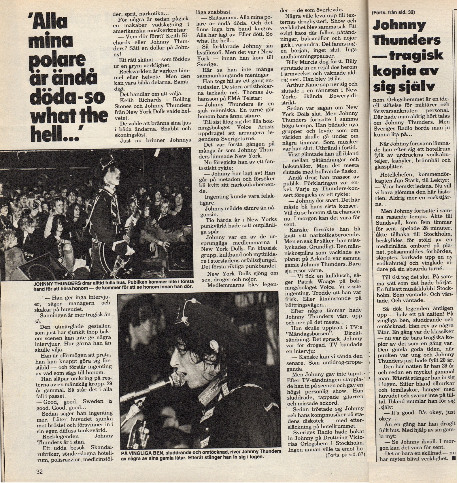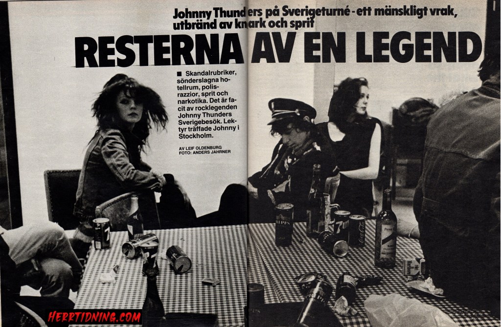 När Johnny Thunders besökte Sverige 1982 för en kortare turné och ett besök på SVT-programmet Måndagsbörsen, så var han rätt nergången och sliten av sitt missbruk. Journalisten Leif Oldenburg text av Thunders besök i Sverige är ren och skär misär. Artikeln publicerades i Lektyr nr 16 1982.
