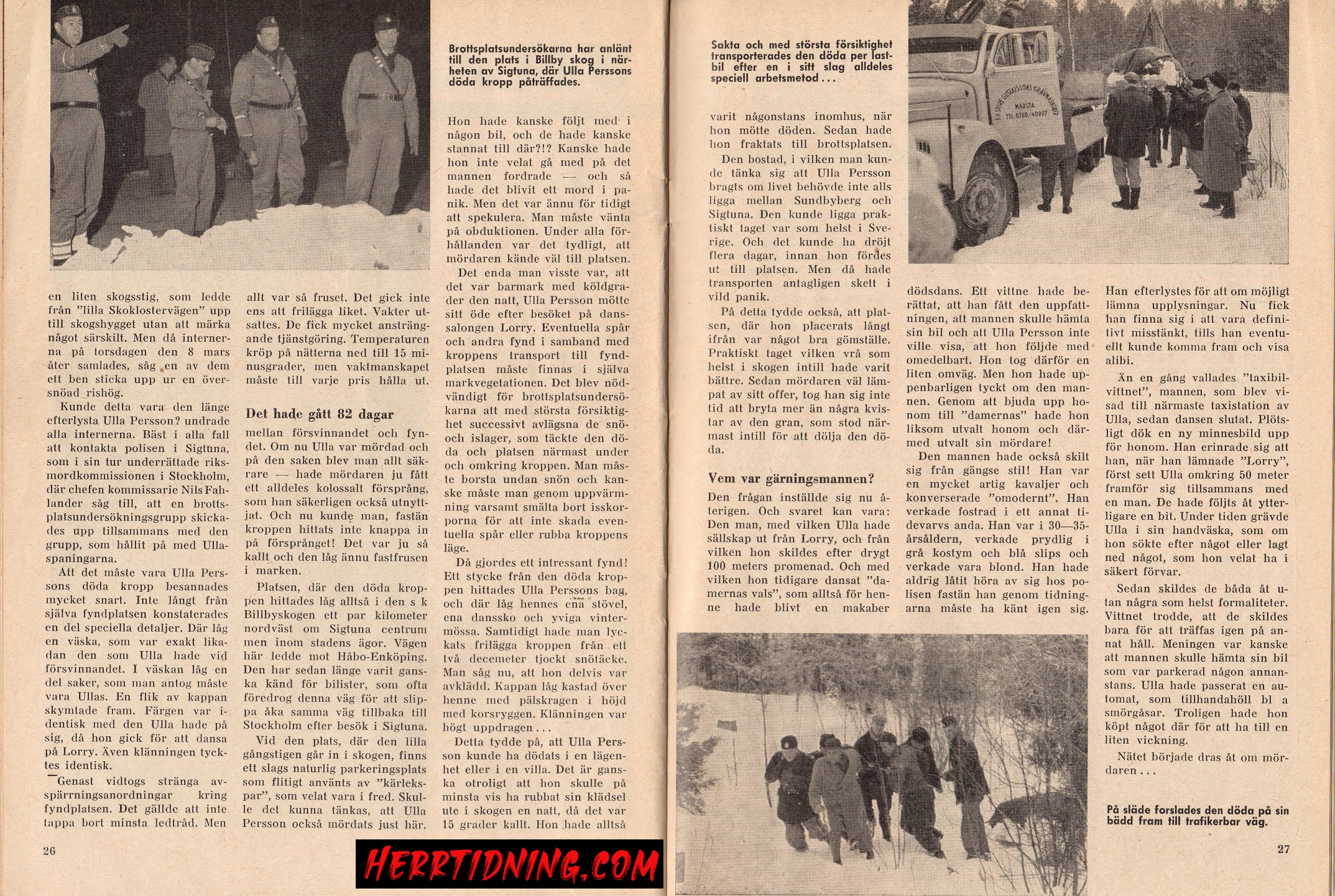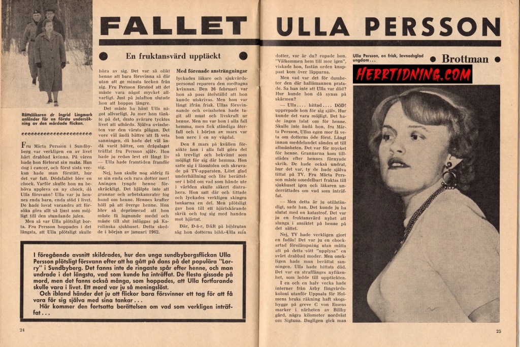 Men det skulle dröja tills den 8:e mars 1962 innan Ulla Persson hittades av interner från Uppsala som fann henne när de hade skogsarbete i Billby utanför Sigtuna. Hon var mördad och fastfrusen i snön.