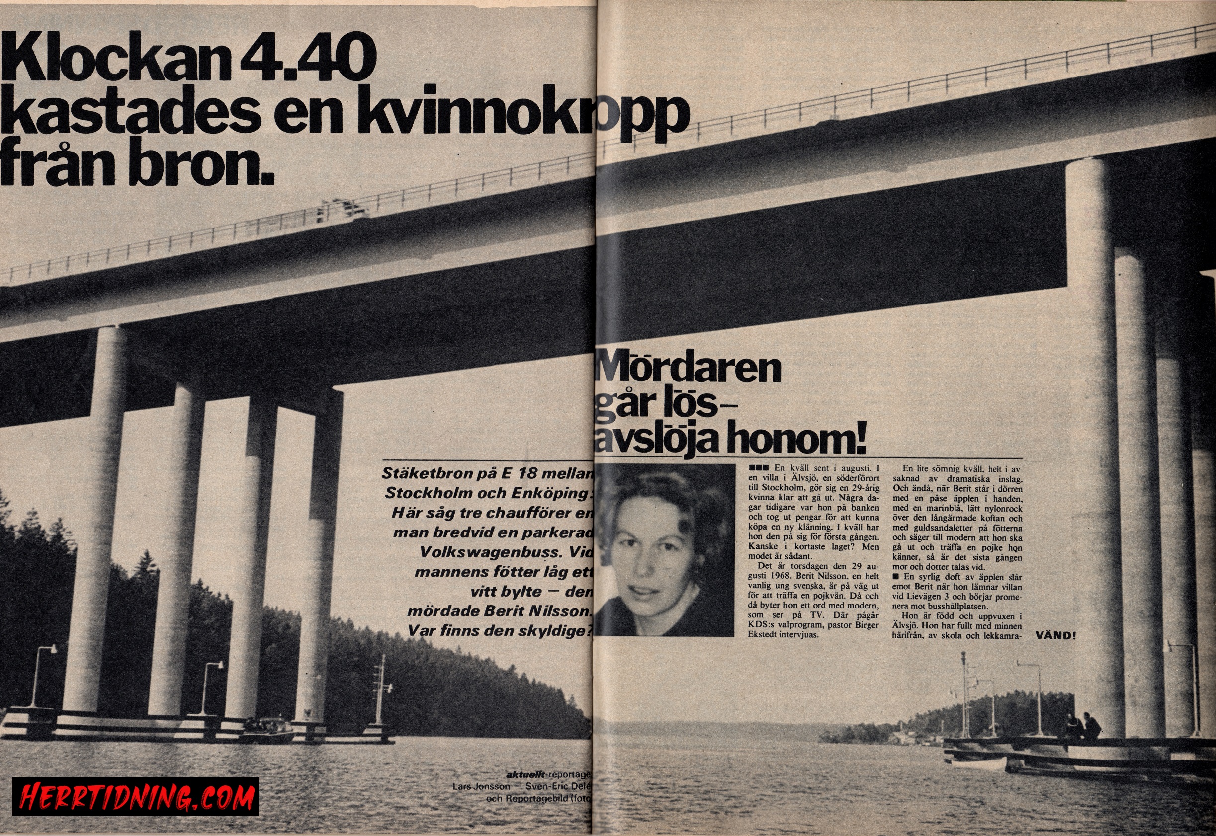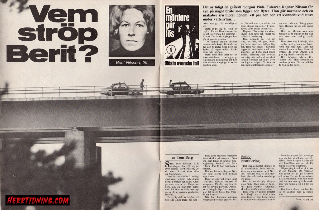 Ganska snart så kan polisen identifiera offret som en Berit Nilsson, en 29-årig kvinna som bor tillsammans med sin mor och 24-åriga broder i en villa i Älvsjö. Berit hade spår av slag i ansiktet och hade blivit strypt till döds. Strax innan mordet så hade hon haft sexuellt umgänge.