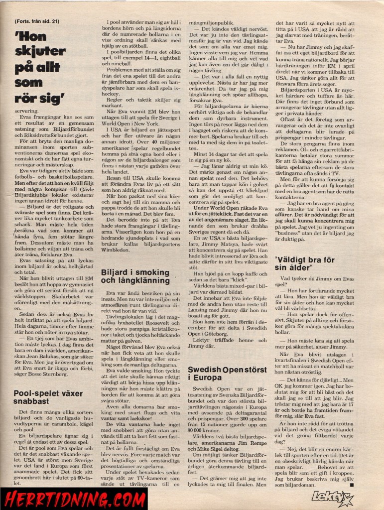 I Lektyr nr 10 1982 så intervjuar journalisten Benny Rudarp den då 17 åriga Gävletjejen Eva Svensson som satsar stenhårt på att bli bäst i världen på biljard. Så här 41 år senare så får man säga att hon fick rätt. Ewa Laurance, som hon heter i dag, blev världsmästare 1994 och har förutom det vunnit mängder av tävlingar och fått smeknamnen ”The leading lady of billiards” och ”The striking viking”.