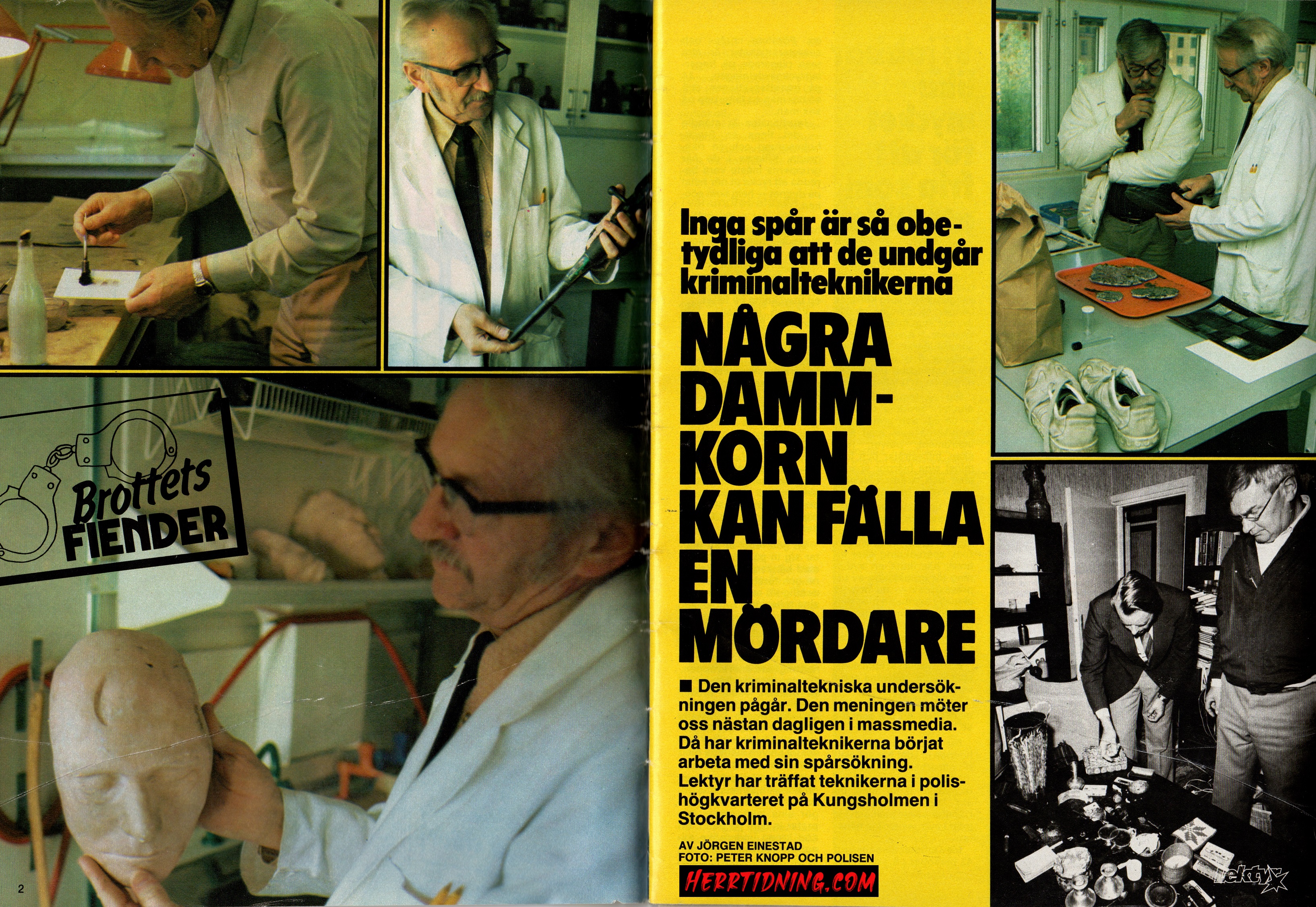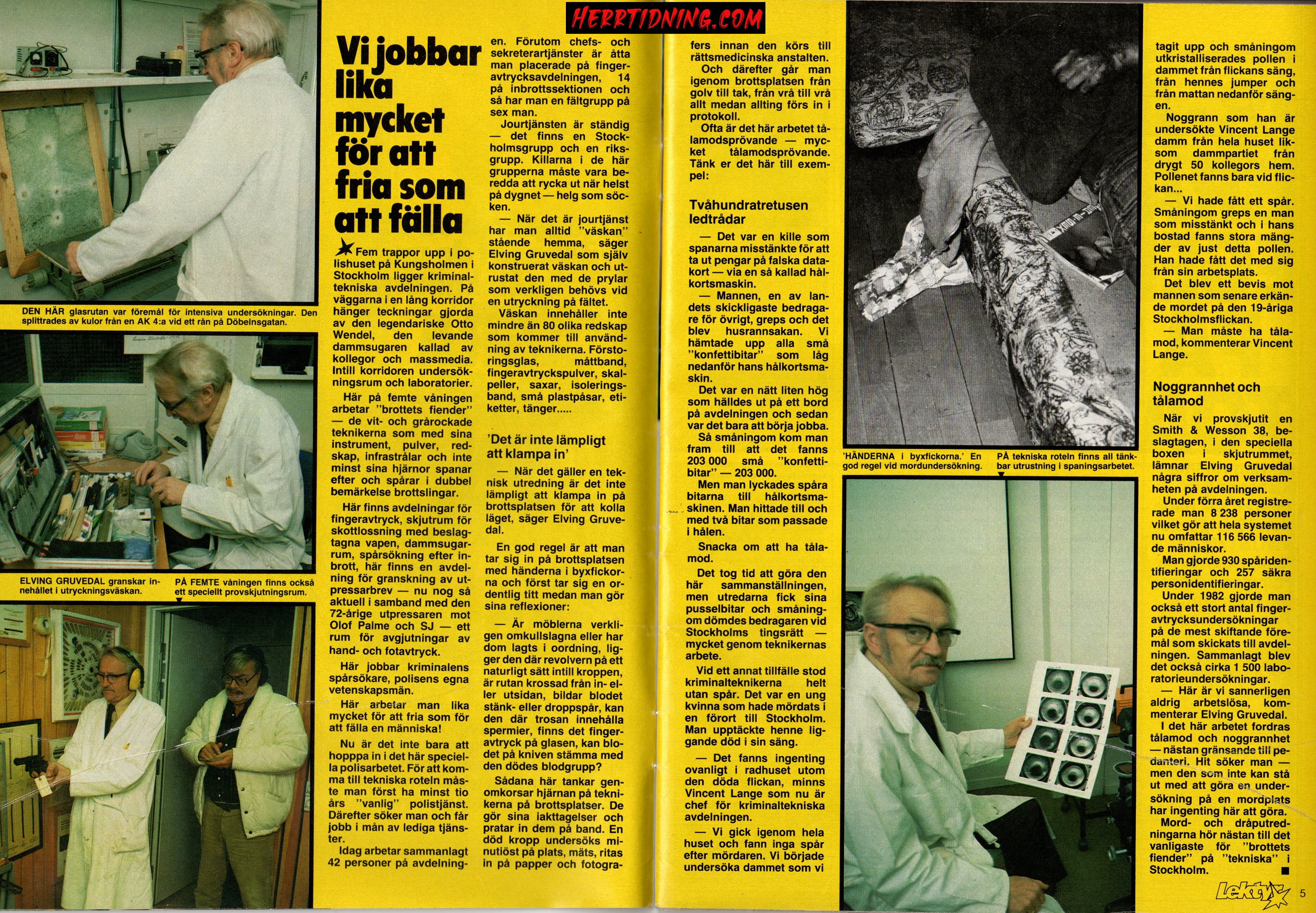 Journalisten Jörgen Einestad besöker kriminalteknikern Elving Gruvedal på den kriminaltekniska avdelningen i Stockholm 1983. Elving Gruvedal skulle senare (2010) skriva en bok om Palmemordet, ”Den slutliga sanningen om Palmemordet : en annorlunda mordutredning : nygamla indicier”.
