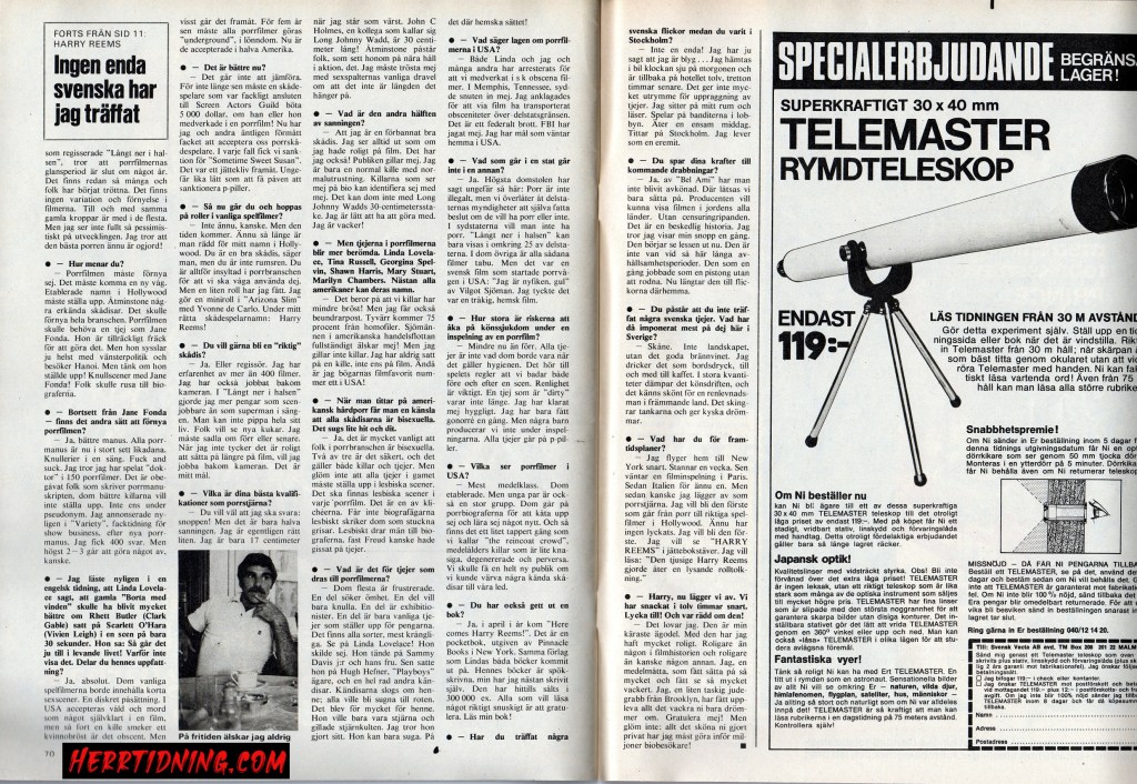 När porrlegendaren Harry ”Långt ner i halsen” Reems är i Stockholm 1975 för att spela huvudrollen i den svenska filmen Bel ami så möter han upp med journalisten Olof Lennart Praesto för en intervju. Till exempel så frågar Praesto vad som har imponerat mest på Reems under besöket i Sverige. Reems svarar ”Skåne. Inte landskapet utan det goda brännvinet. Jag dricker det som bordsdryck, till och med till kaffet. I stora kvantiteter dämpar det könsdriften, och det känns skönt för en renlevnadsman i främmande land. Det skingrar tankarna och ger kyska drömmar.”