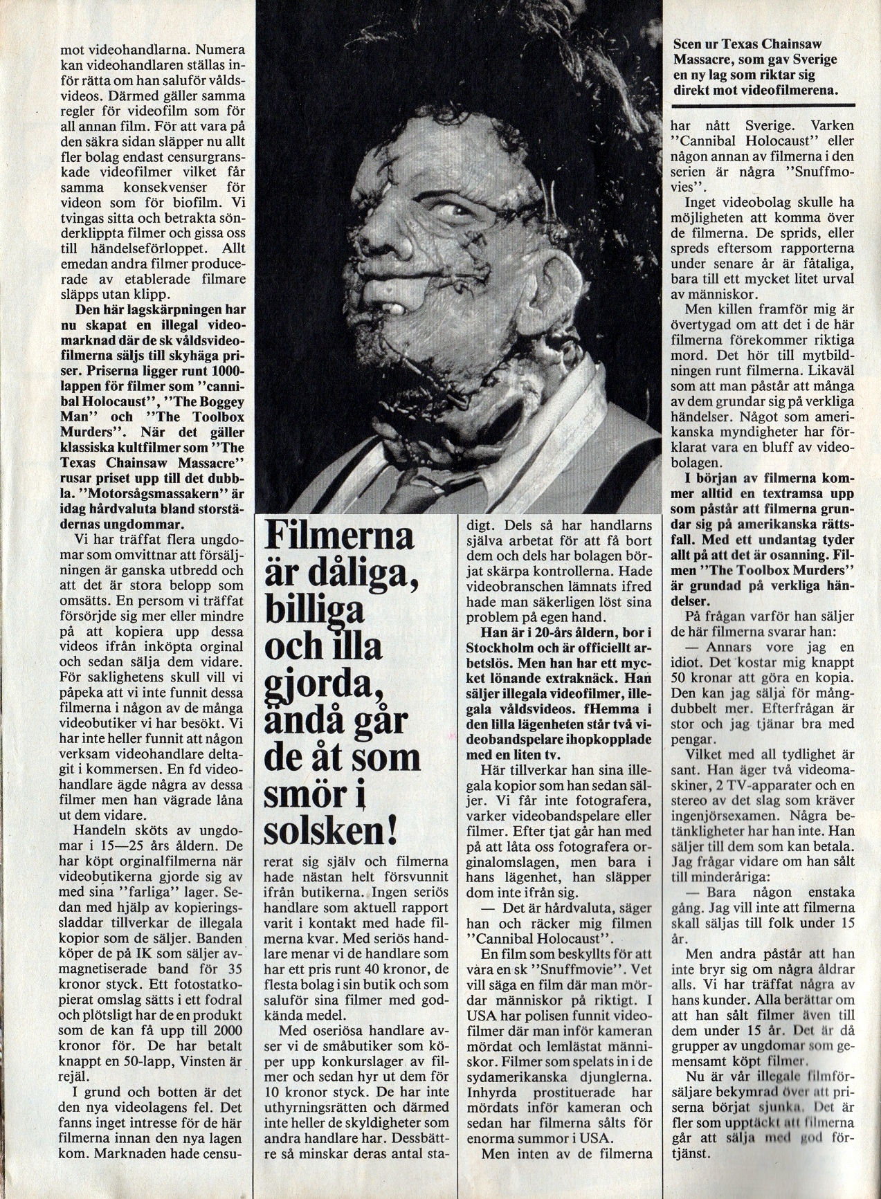 Åh, kära 80-talet med sin moralpanik om när videon var ny på marknaden. Ofta så brukar dessa artiklar ha en syn att dessa ”våldsfilmer” är skräp (check i artikeln) och rätt så ofta så brukar de ha sakfel, så även i denna artikeln från Aktuell rapport nr 51/52 1986. Journalisten Mikael Jakobsson har fel att Cannibal holocaust inte skulle ha släppts i Sverige på video. Den fanns släppt, om än klippt, från kultbolaget Video invest.