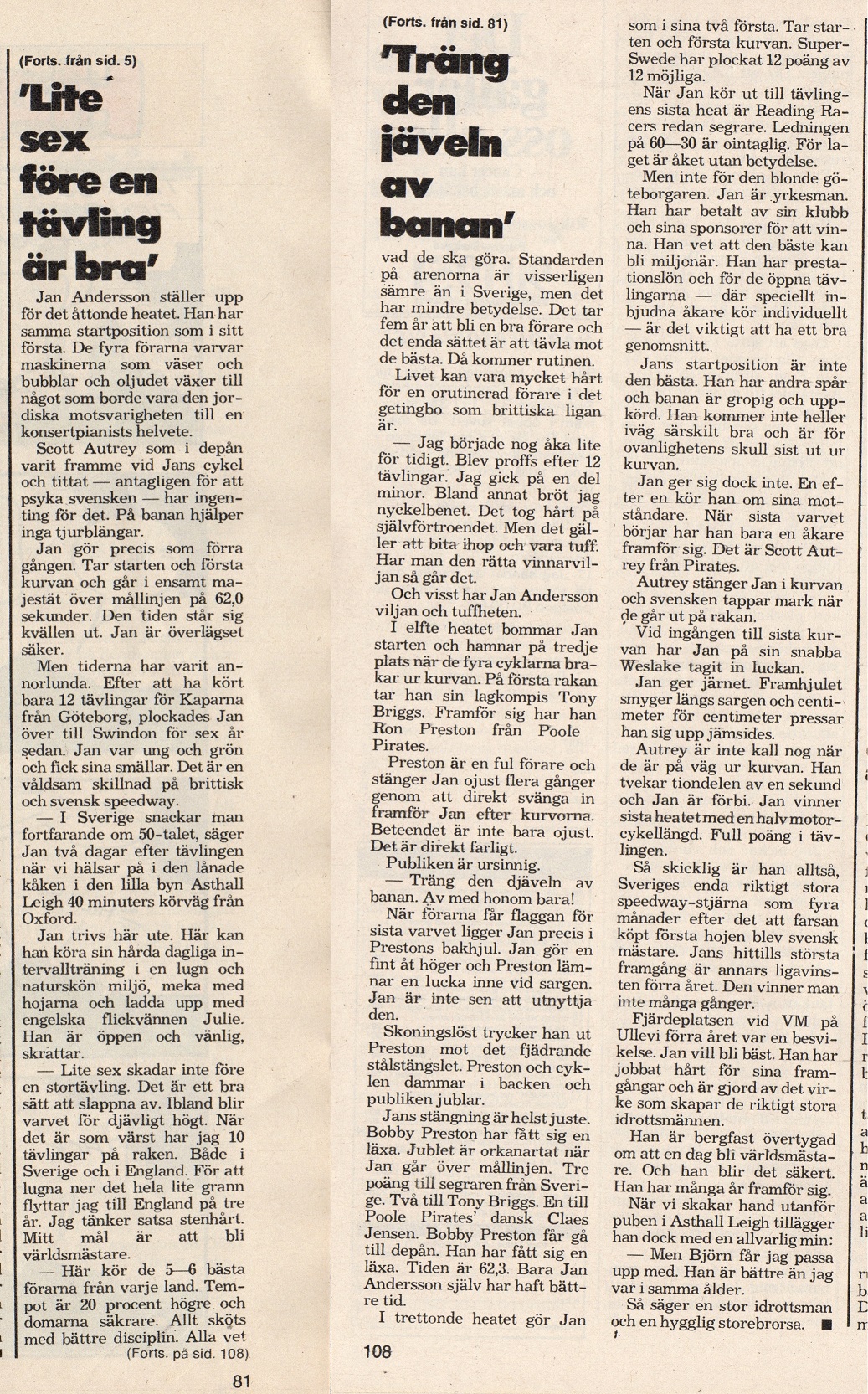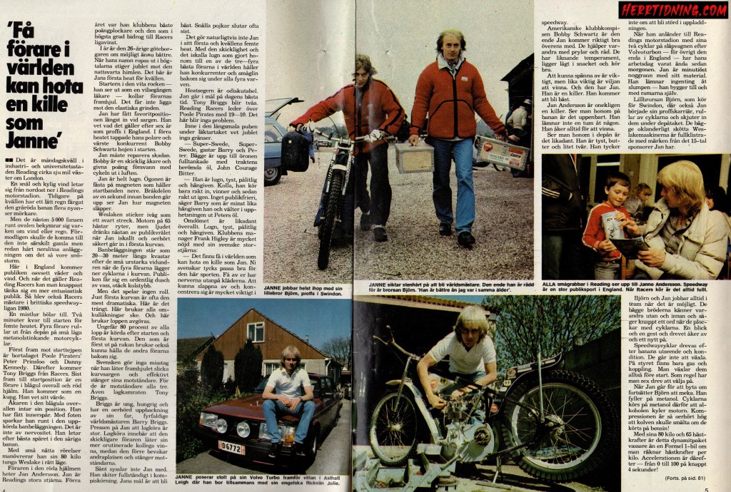 Janne körde för klubben Reading racers mellan 1978-1988 och 1990-1992. Det var när han körde för Reading racers som Lektyrs journalist Per Odebrant hälsa på för ett reportage i nr 29 1981. En välmatad artikel med schyssta bilder, så luta er tillbaka med en pucko och läs om när Janne var kung i Reading.