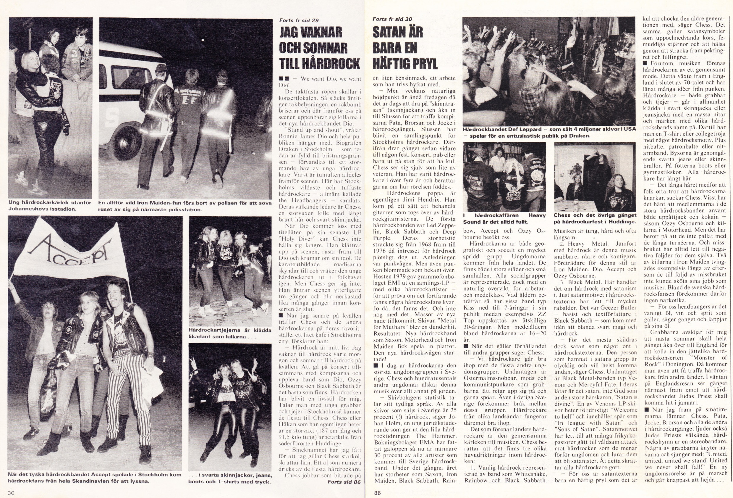 Underbara bilder och en text som är ren poesi: ”När Dio kommer loss med titellåten på sin senaste LP ”Holy Diver” kan Chess inte hålla sig längre. Han klättrar upp på scenen, rusar fram till Dio och kramar om sin idol. De karateutbildade roadisarna skyndar till och vräker den unge hårdrockaren ut i folkhavet igen.”