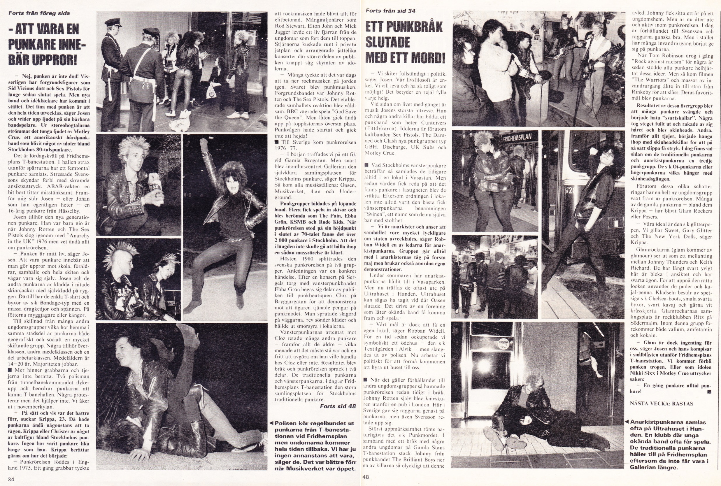 I nr 48 1983 så publicerades den tredje delen av Stopp fib aktuellts artikelserie om de nya ungdomsgängen i Stockholm. Denna gången handlar det om punkarna. Fast, flera av dem ser mer ut som sleazerockare (och de säger att de lyssnar på Mötley Crue) än rena punkare.