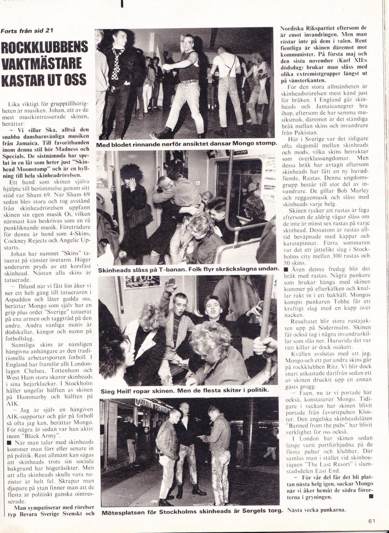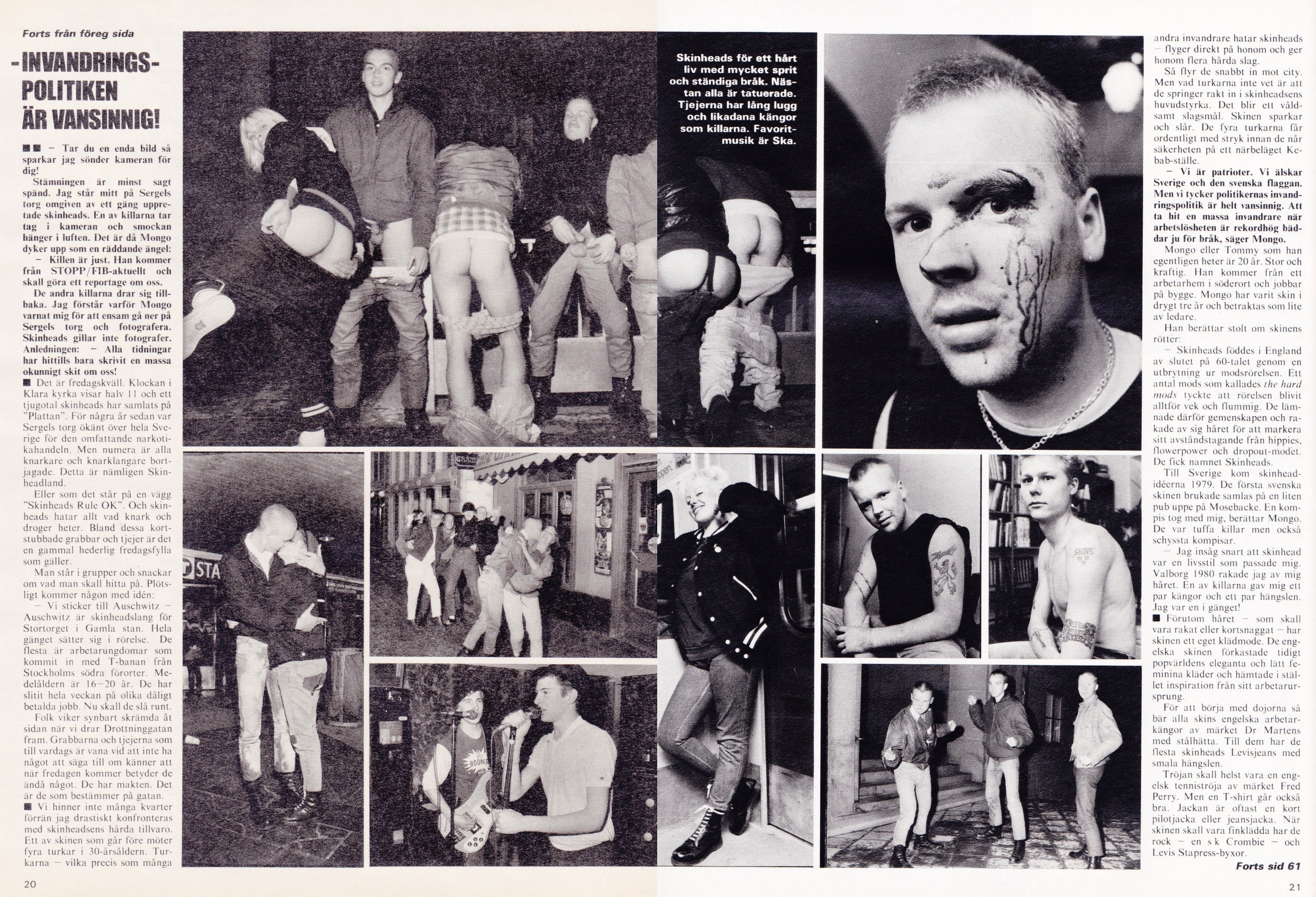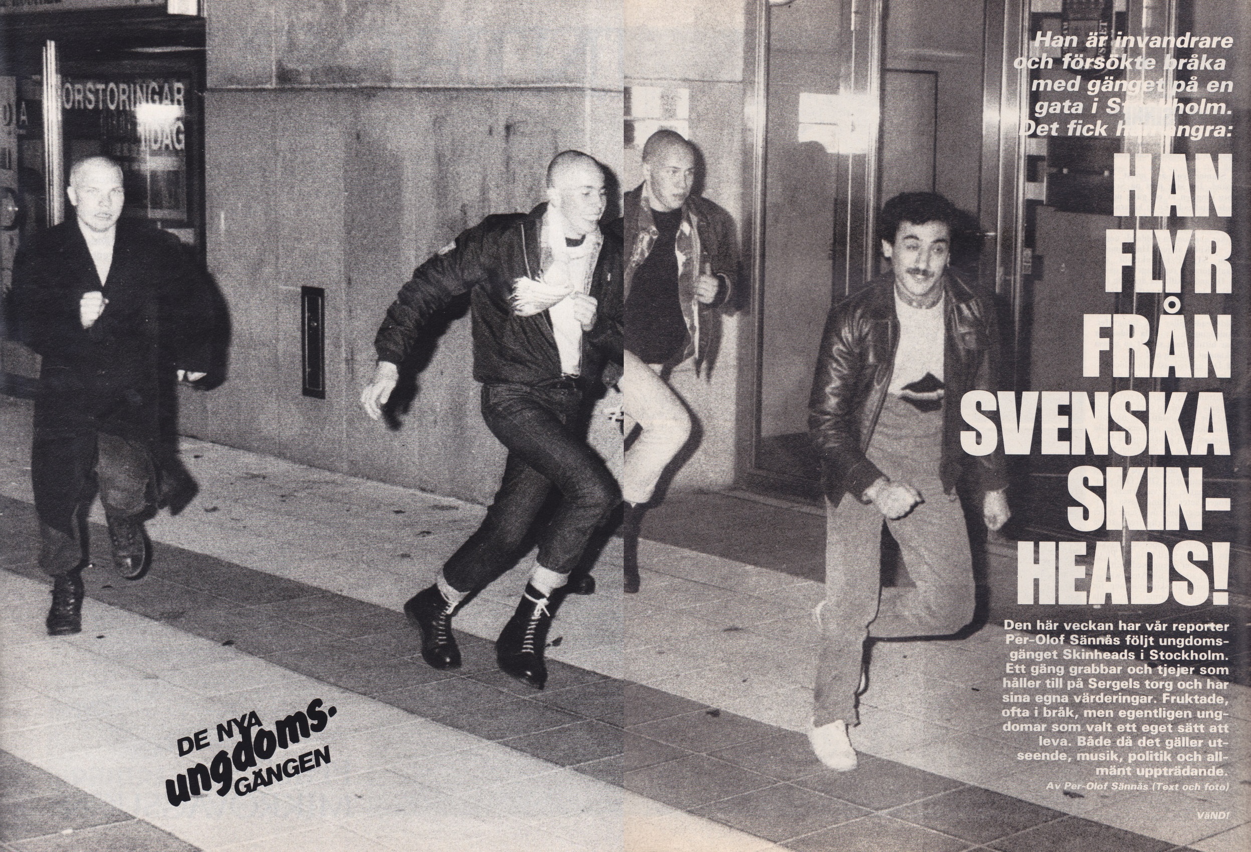 1983 hade herrtidningen Stopp fib aktuellt en artikelserie om de nya ungdomsgängen i Stockholm. I första artikeln fick man följa modsen. I artikel två, som publicerades i nr 47, så följer Per-Olof Sännås skinheadsen.