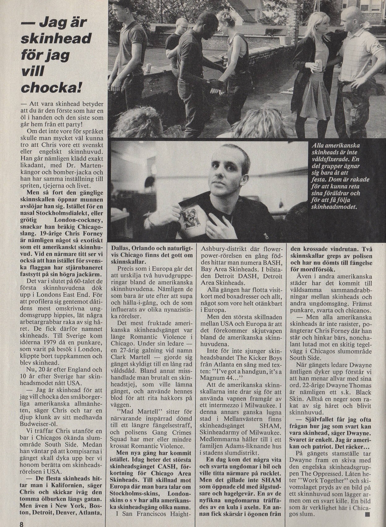 Och slutligen så har vi en artikel i Aktuell rapport nr 9 1989 där journalisten (och fotografen) Per-Olof Sännås skriver om amerikanska skinheads.