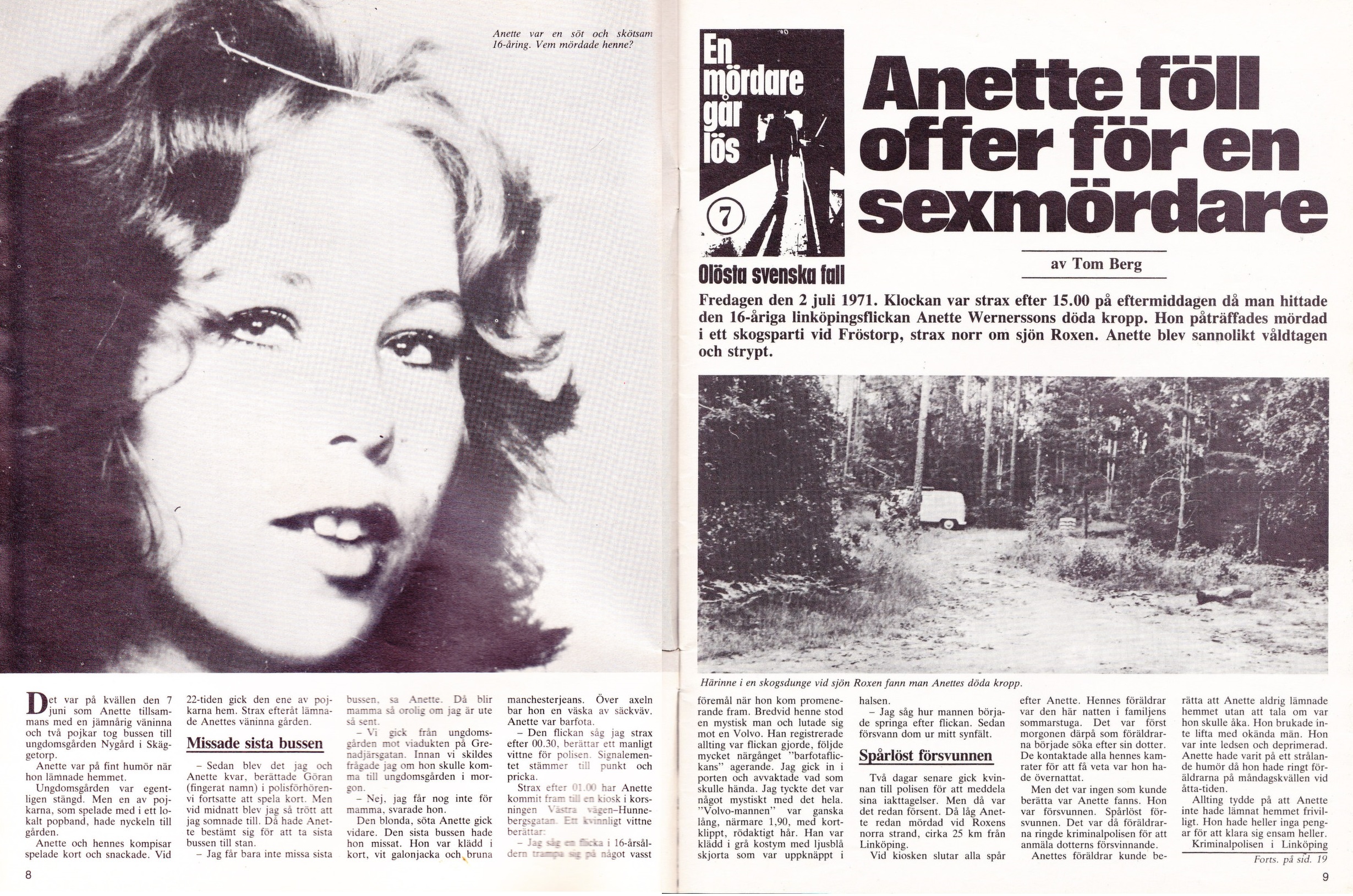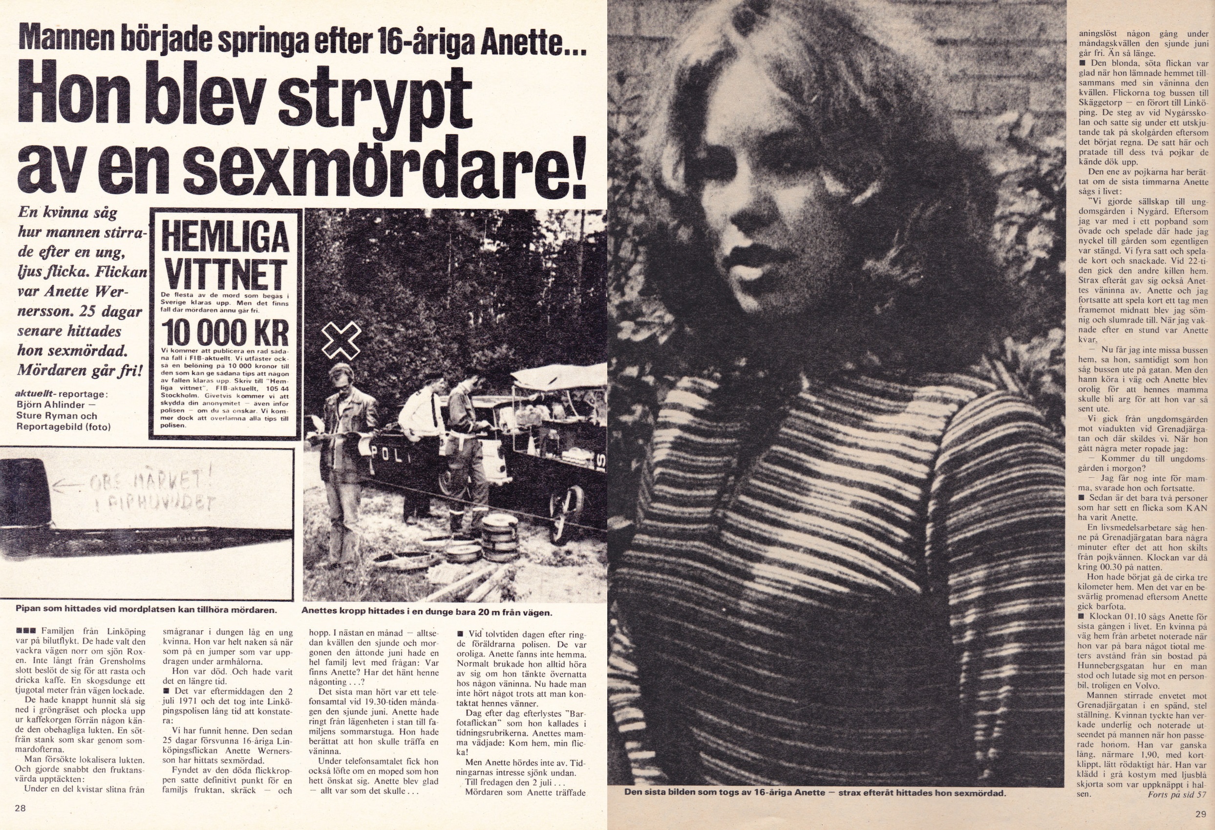 Natten mellan 7:e och 8:e juni 1971 försvann 16 åriga Anette Wernersson från Linköping efter hon varit på den lokala fritidsgården under kvällen. Under 25 dygn levde familjen i ovisshet om vart Anette var, om hon levde än eller vad som hade hänt henne. 2a Juli så fann ett par hennes livlösa kropp.