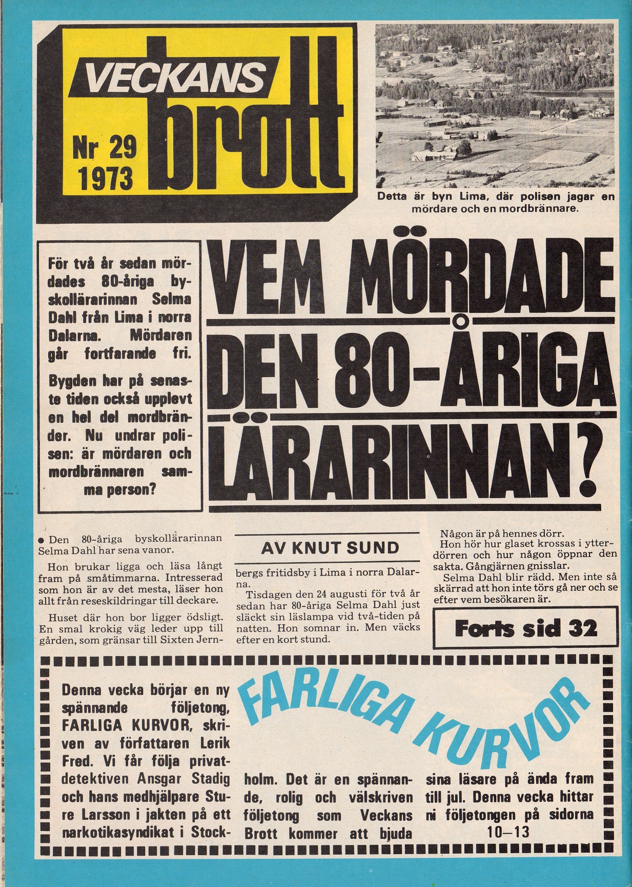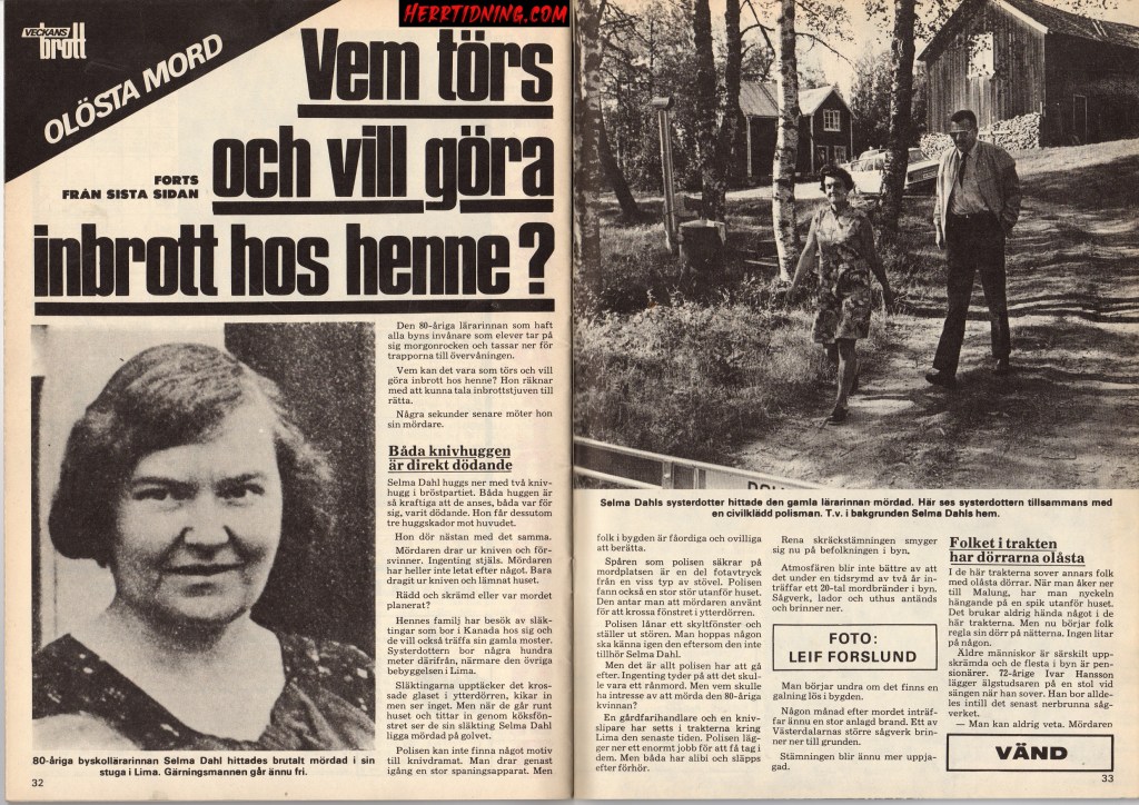 Journalisten Knut Sund skriver om mordet på Selma Dahl i Veckans brott nr 29 1973. 80-åriga Dahl blev mördad natten den 24:e augusti 1971 i sitt hem i Lima med knivhugg i hjärtat. Ett brott som än idag är olöst fast enligt vissa polisiärt uppklarat. Det finns en del nyare artiklar som tas upp i flashback-tråden om fallet som jag kan rekommendera.