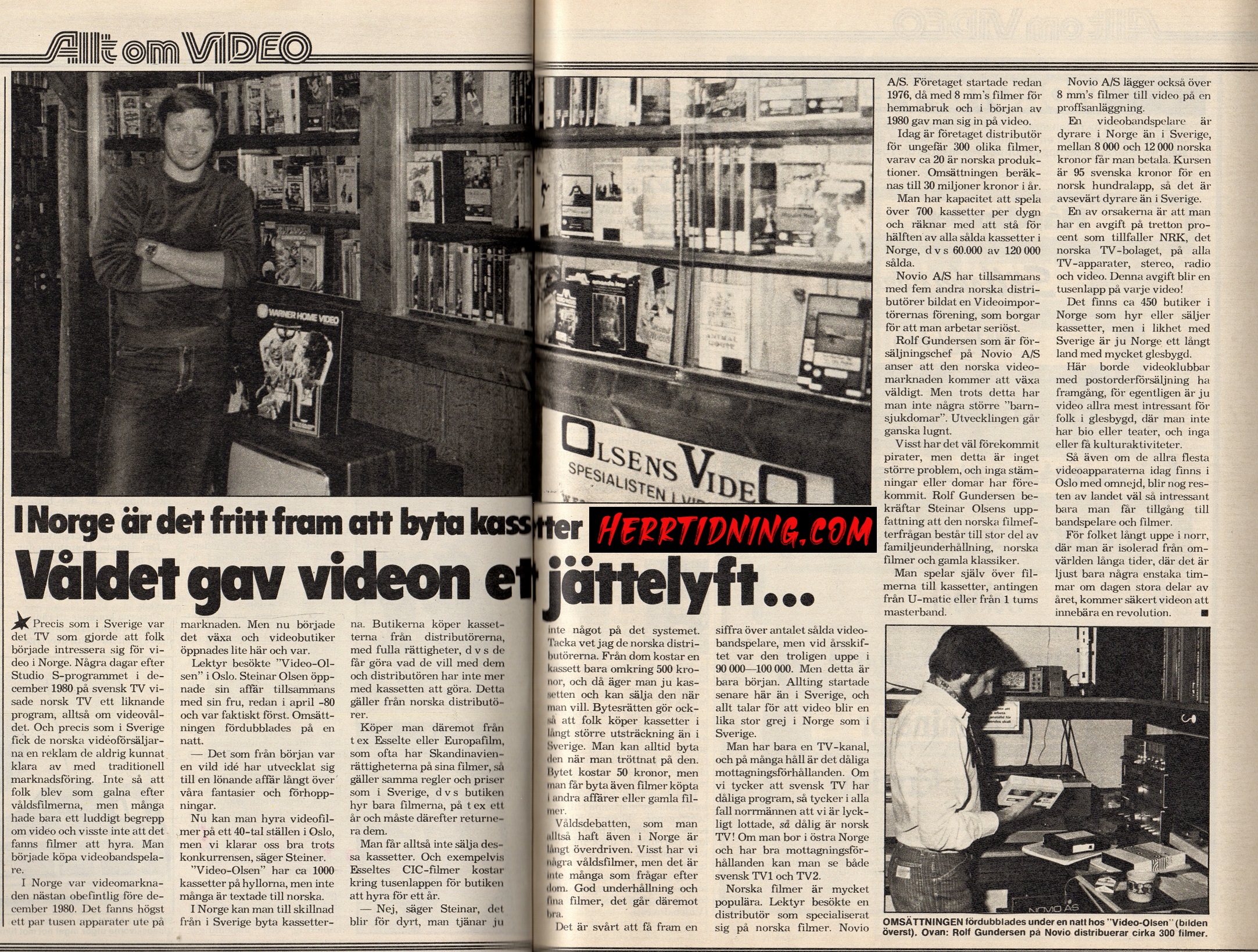 Lektyr gjorde ett besök till Norge i nr 5 1982 för att ta tempen på deras videomarknad. Först besöker de Steinar Olsen som äger Olsens video (”Video-olsen”) i Oslo. En kort och intressant intervju om skillnaderna mellan Sverige och Norge.